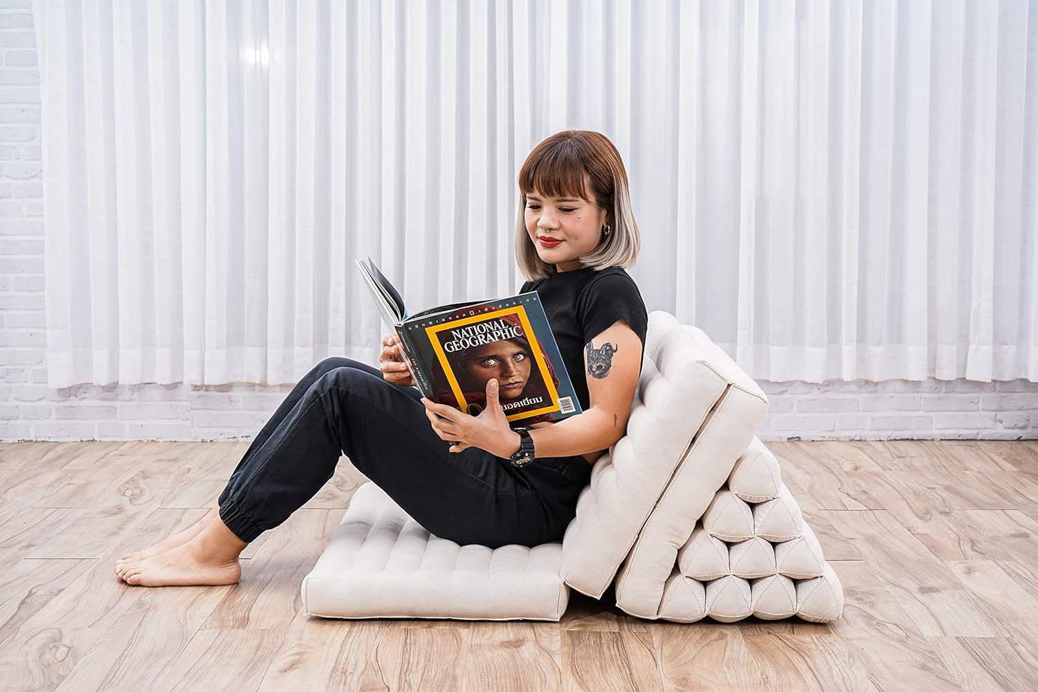 - Material: The Thai triangle pillow and the floor mat for adults is filled with natural kapok. The breathable fiber used for the floor cushions allow for a pleasant and comfortable seating position