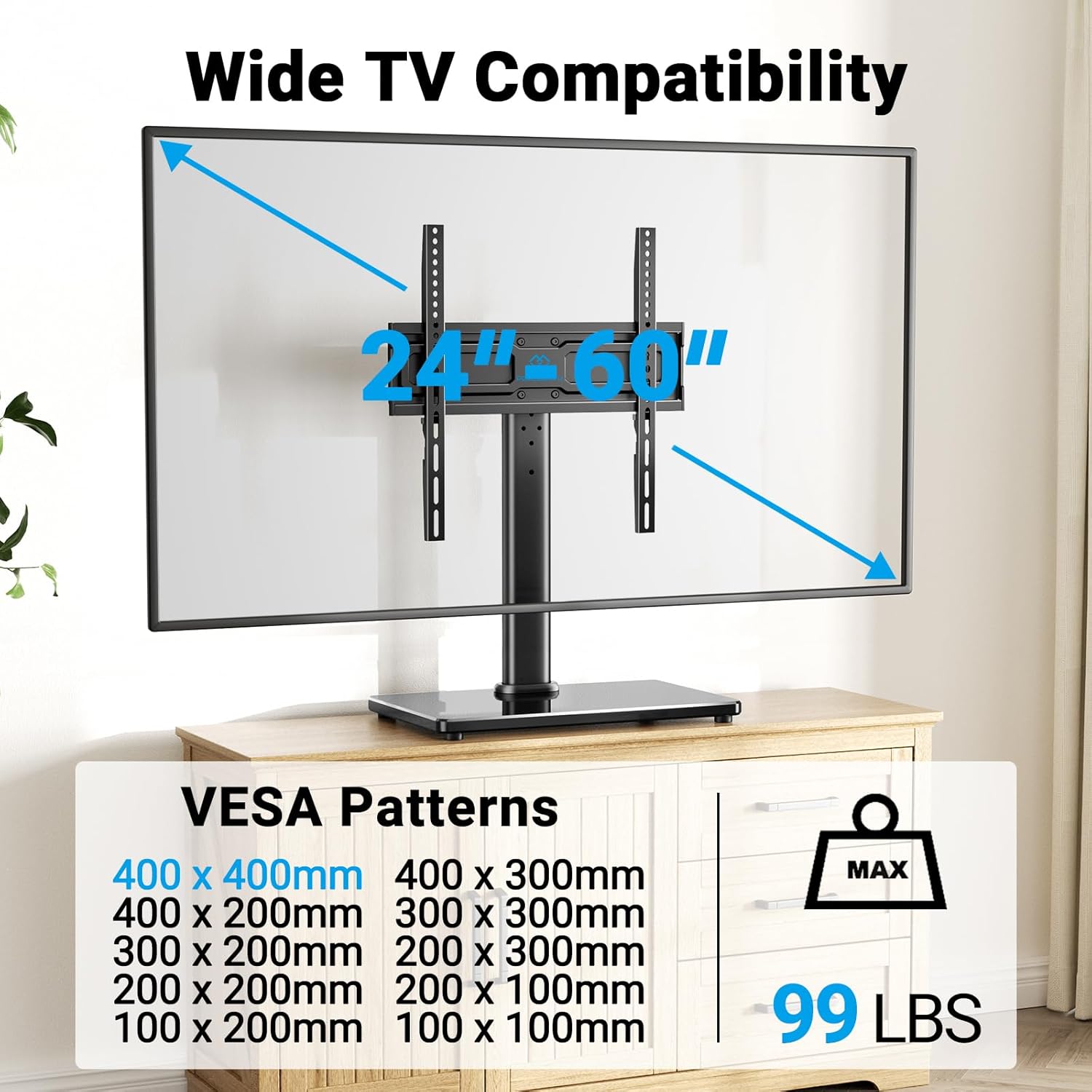 - Wide Compatibility: Our universal TV stand is designed to accommodate TVs of all types and sizes. Supporting screens from 24 to 60 inches and VESA patterns from 100x100mm to 400x400, weighing up to 99 lbs. The swivel TV stand is versatile enough to fit various TV models, including LCD, LED, OLED, QLED, Plasma, Light, Smart TVs, and even bulkier older models.
