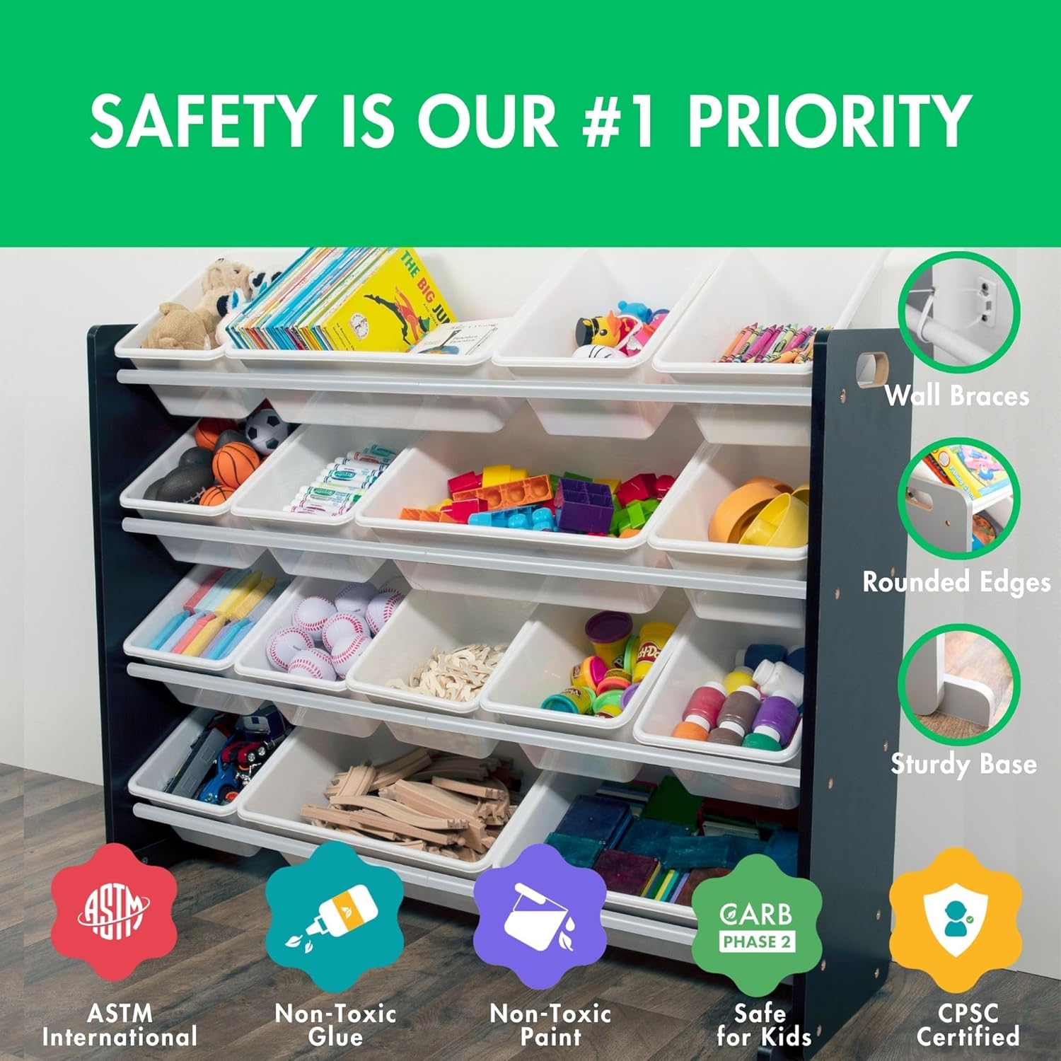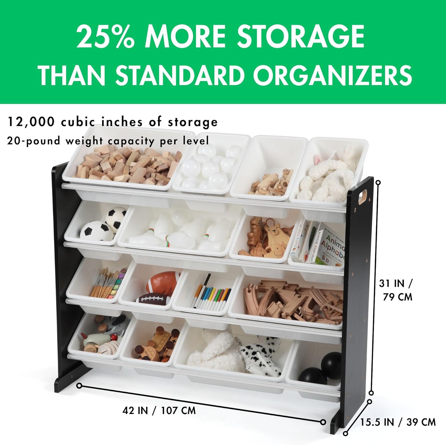 - Supersized Storage Solution: Transform clutter with this 16-bin toy organizer. With 12 standard and 4 large bins, it offers 25% more storage than standard organizers, making it perfect for large toy storage and keeping your kids' space tidy.