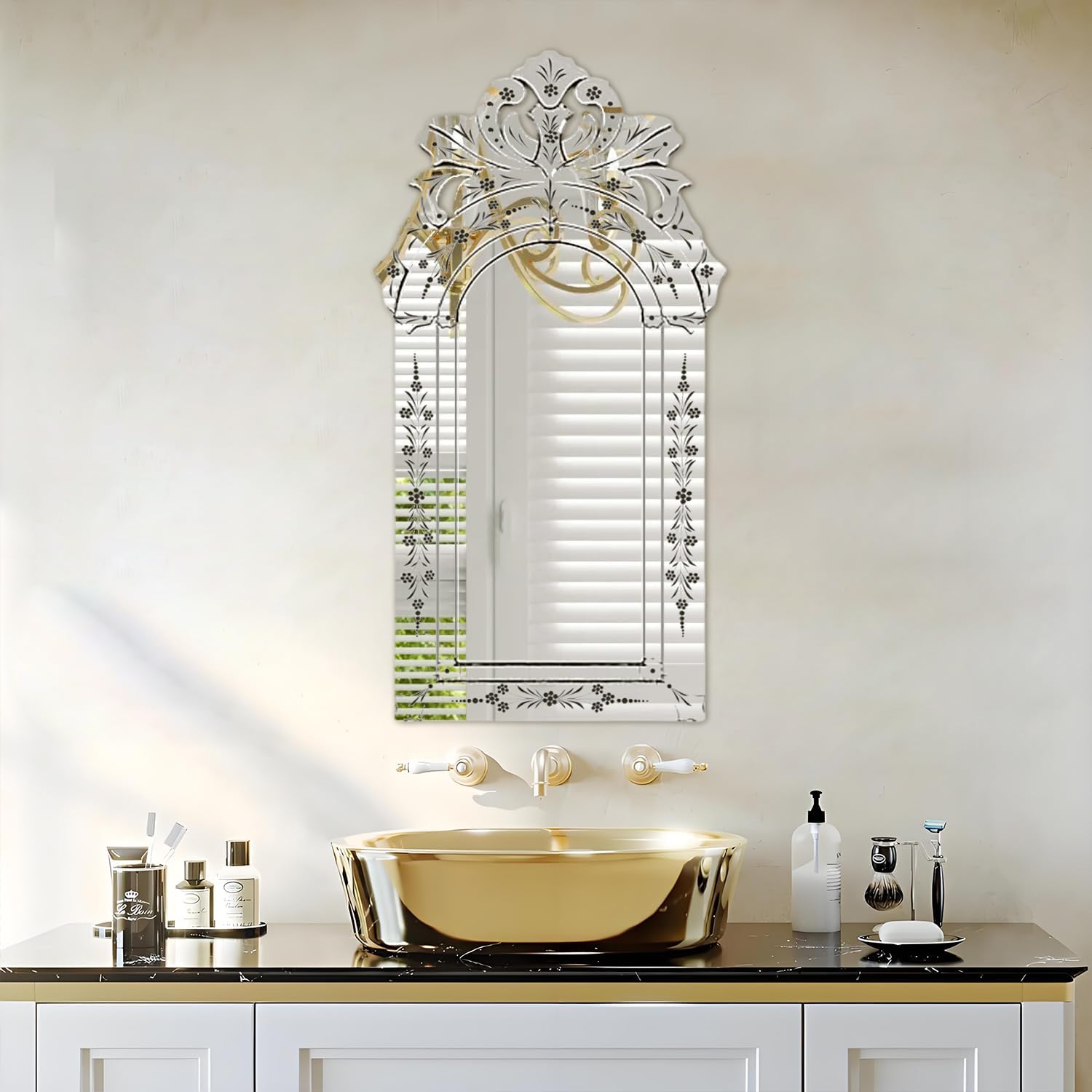 - Design: Decorative mirror it boasts intricate decorative patterns, an arched top, and delicate floral motifs, exuding vintage charm and classic elegance. Perfect as a vanity mirror or bathroom mirror.