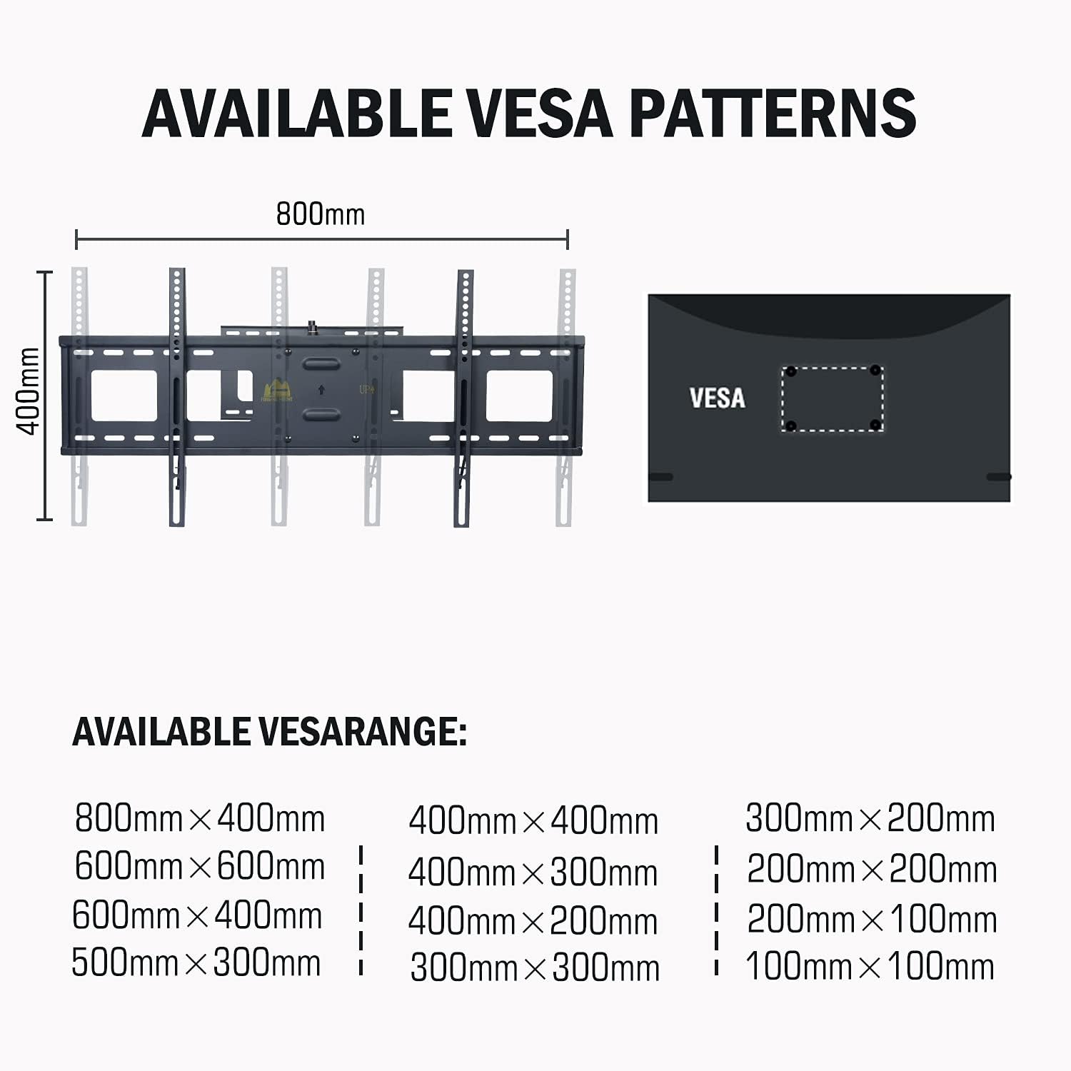 - UNIVERSAL TV MOUNTยท: This Full motion TV wall mount Fits most 42"-95" Flat/curve LCD LED OLED TVs, VESA patterns from 100x100mm up to 800x400mm, weighing up to 198lbs, and all the other brands as long as VESA is compatible, therefore please check the VESA pattern, weight, size of your TV before purchasing.