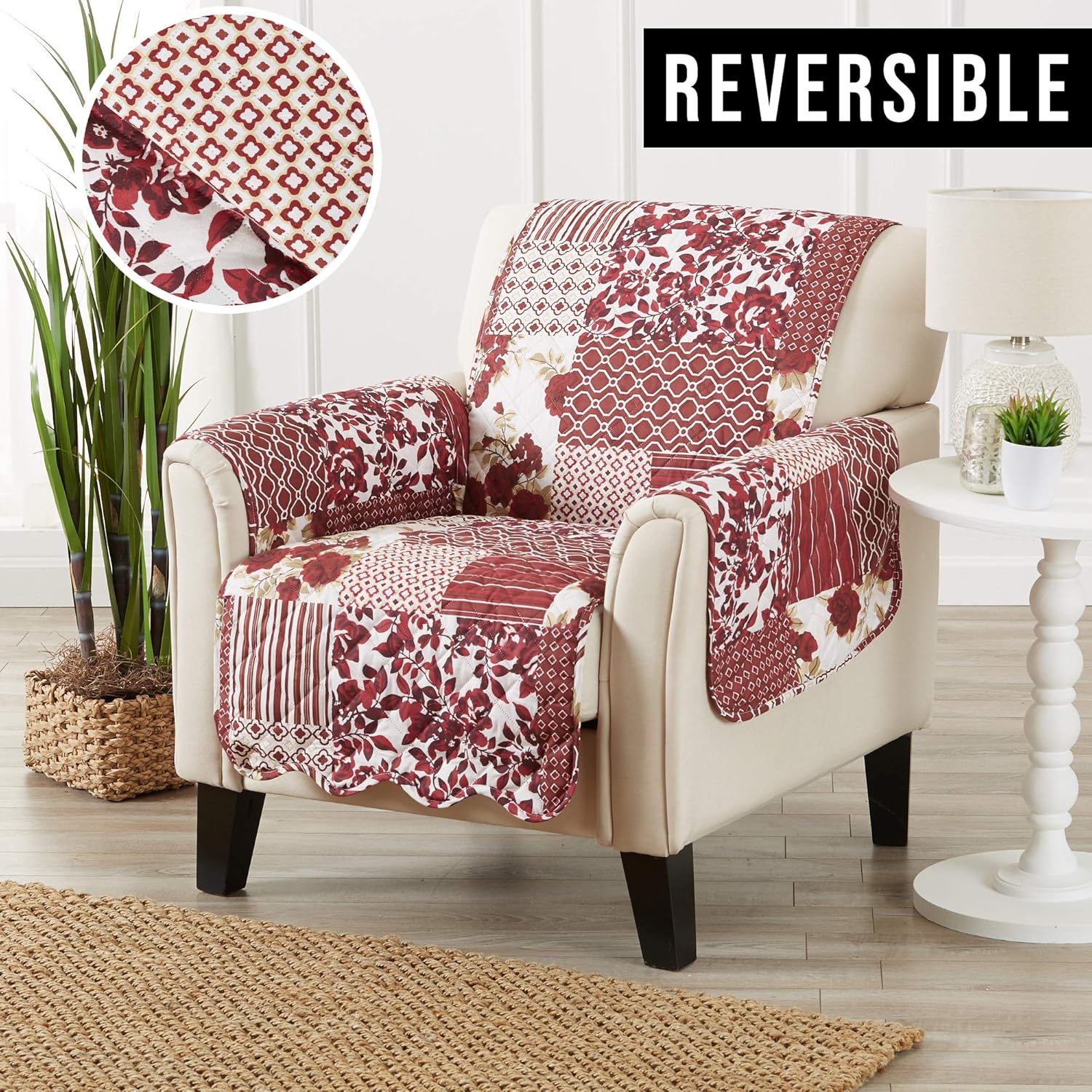 Great Bay Home Patchwork Scalloped Printed Furniture Protector Stain Resistant Chair Cover (Chair, Burgundy)