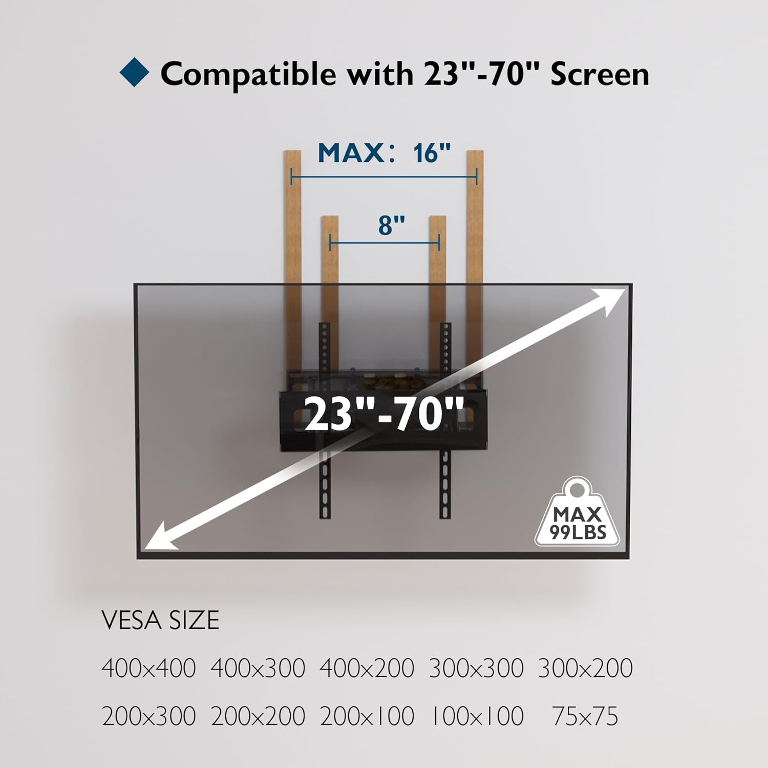 - WIDE COMPATIBILITY FOR MULTIPLE TV SIZES: This TV wall mount fits most LED, OLED, and LCD flat or curved TVs ranging from 23 to 70 inches. The mount supports VESA patterns including 400x400, 400x300, 400x200, 300x300, 300x200, 200x200, 200x100, 100x100, and 75x75 mm. The full motion TV wall mount can hold up to 99 lbs, making it suitable for a wide range of TV models, including 32 inch, 40 inch, 43 inch, 50 inch, 55 inch, 65 inch, and 70 inch TVs.