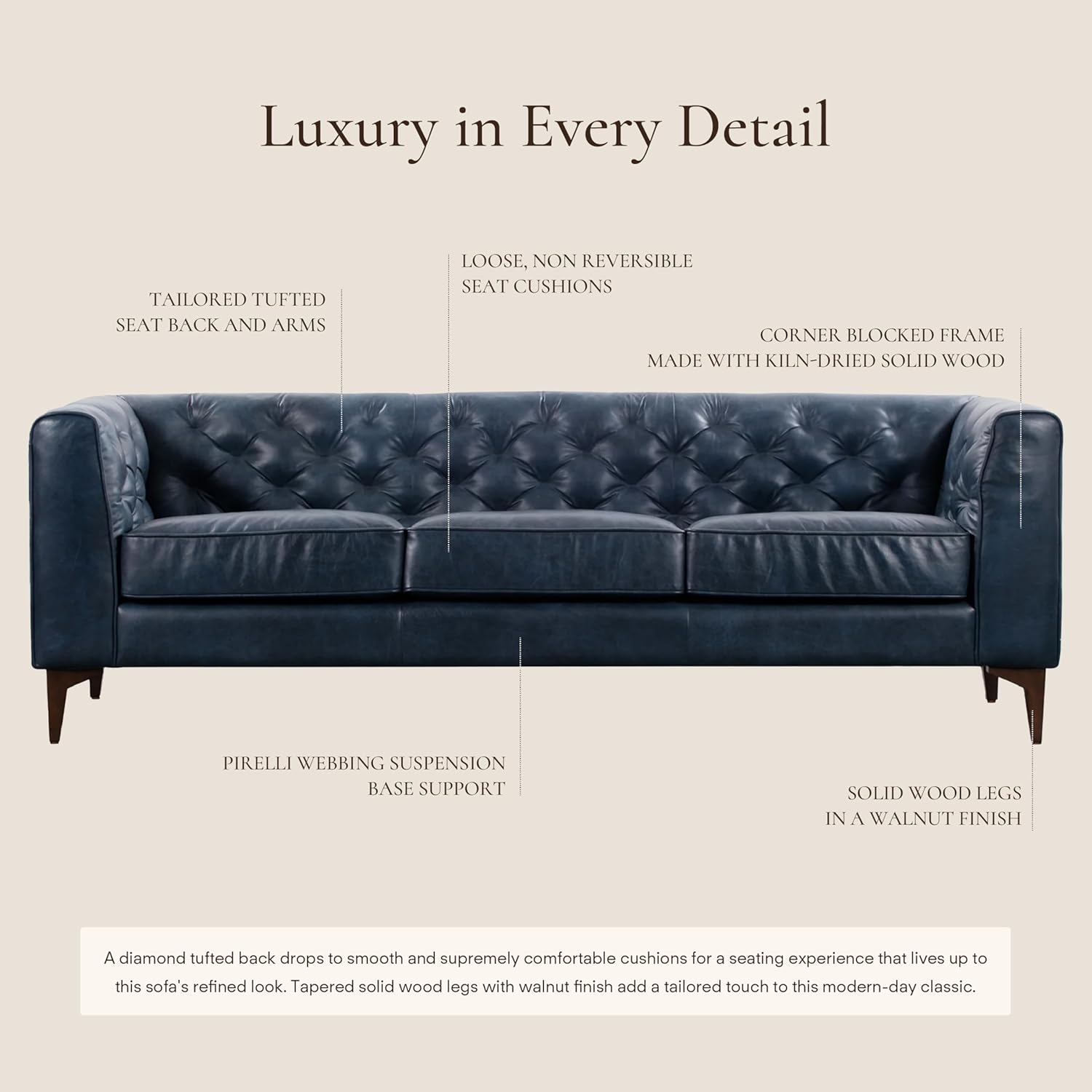 Poly & Bark Essex Leather Couch - 89-Inch Sofa with Tufted Back - Full-Grain Leather Sofa for Living Room with Feather-Down Topper - Living Room Couch - Vintage Italian Leather in Midnight Blue