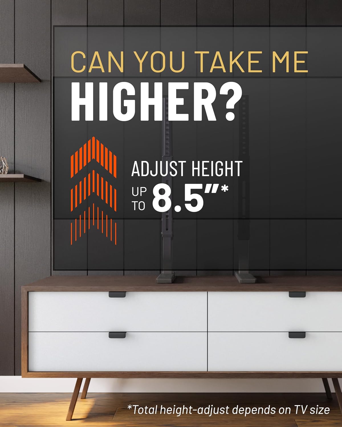 - Height adjustable up to 8.5" to fit your big TV and a soundbar. We even threw in some rubber pads to prevent vibration & give you better sound.