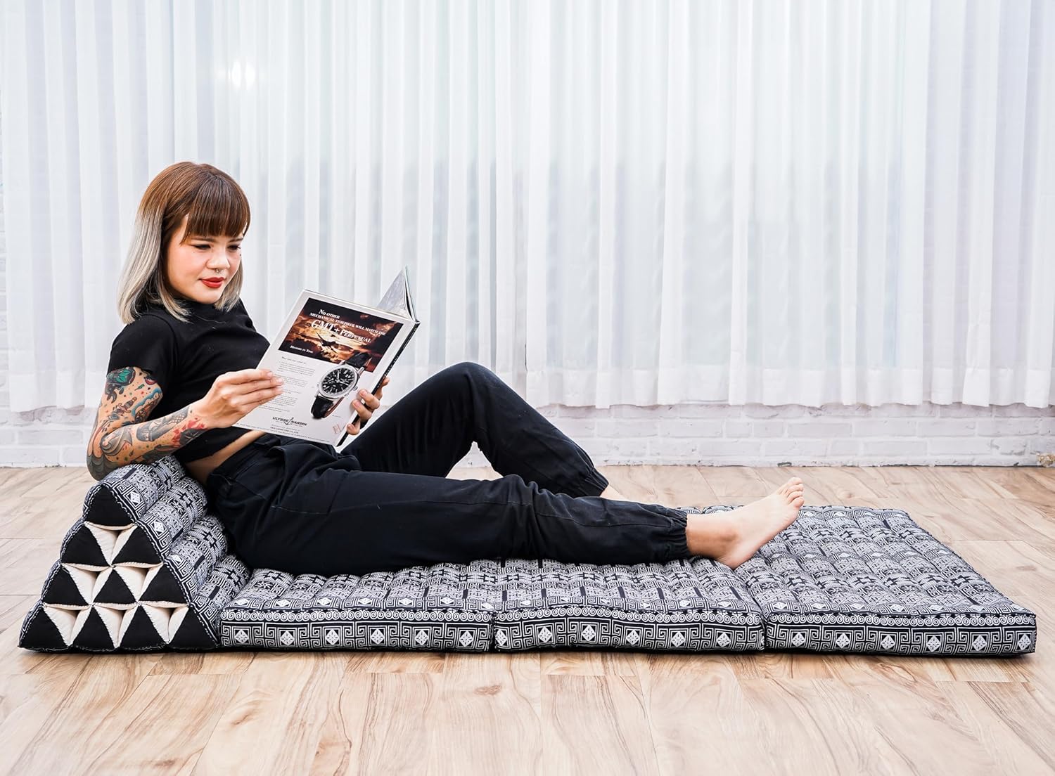 Leewadee 3-Fold Mat XXL with Triangle Cushion – Firm TV Pillow, Foldable Mattress with Cushion Made of Eco-Friendly Kapok, 67 x 31 inches, Black