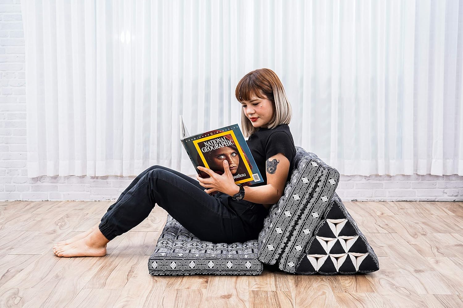 - Material: The Thai triangle pillow and the floor mat for adults is filled with natural kapok. The breathable fiber used for the floor cushions allow for a pleasant and comfortable seating position
