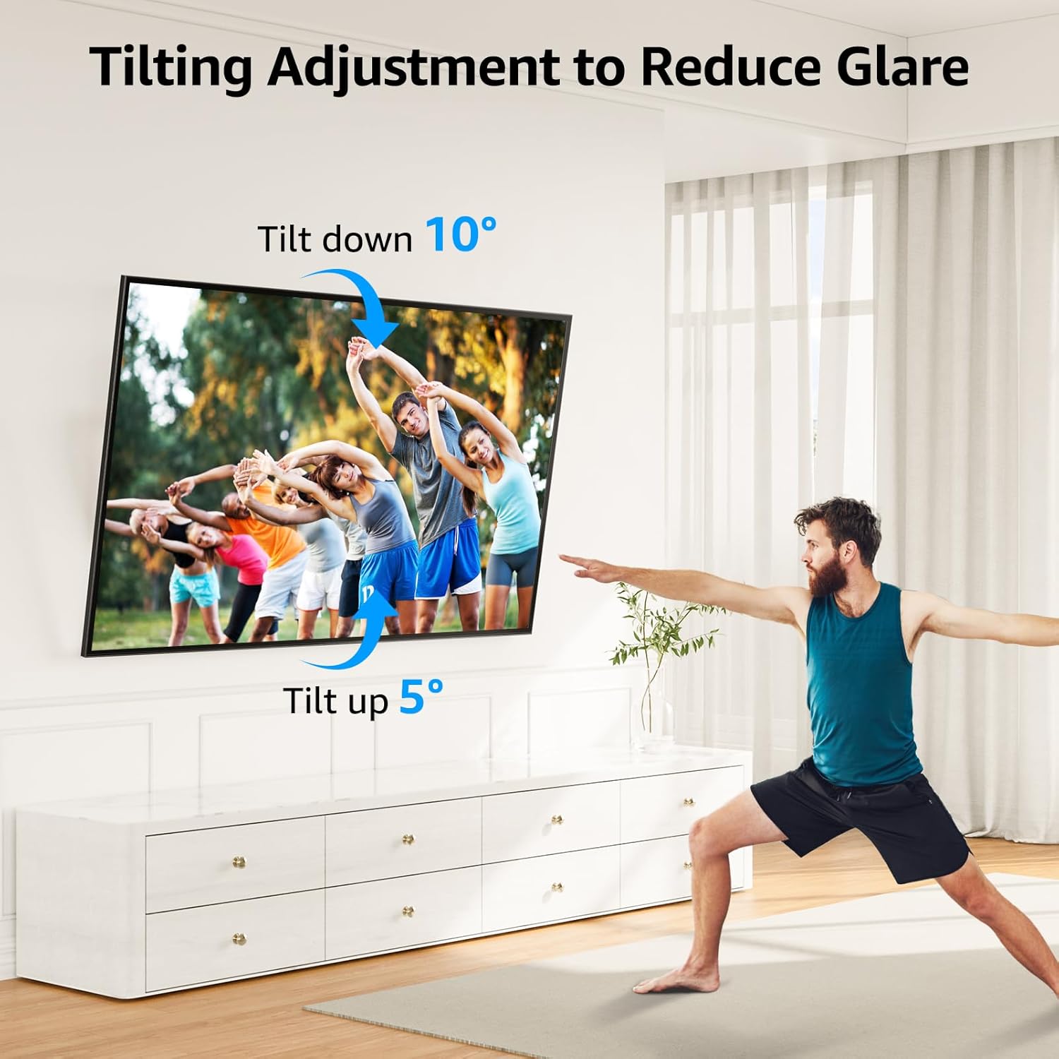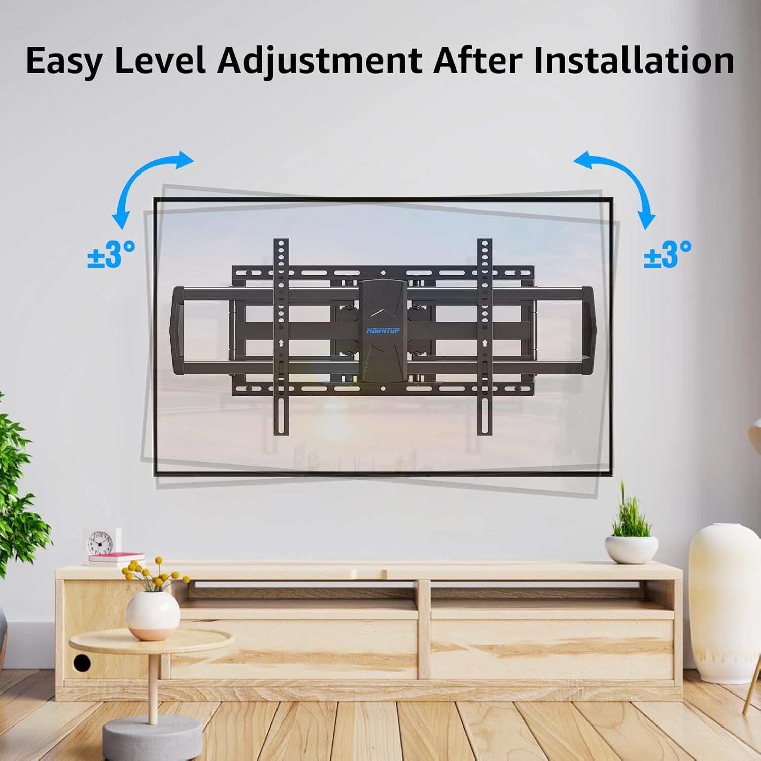 - Full Motion TV Mount: This Articulating TV wall mount 85 can easily swivel 45° left or right at different seat positions, tilt 5° up and 10° down for reducing screen glare, and allow +/- 1° adjustment after mounting for perfect screen leveling. The 86 inch tv wall mount extends 24.4" to bring your TV closer for more comfortable viewing and retracts back 3.7" for smooth movement and space-saving