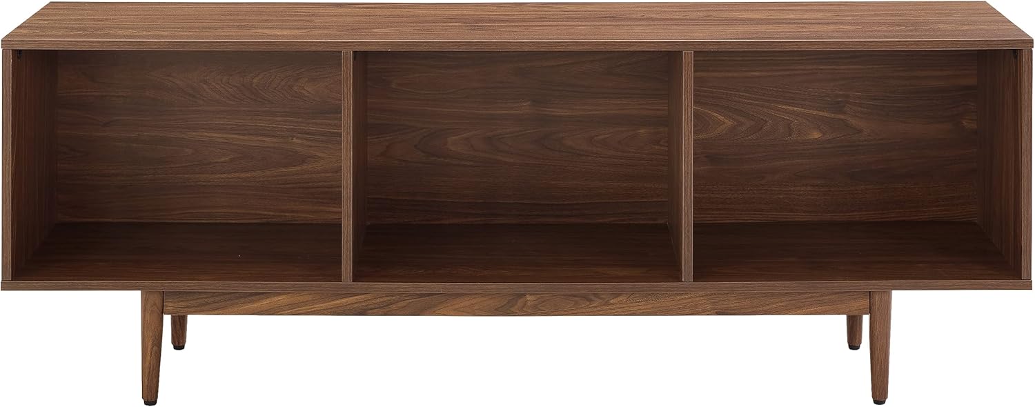 - MID-CENTURY MODERN: With its classic walnut finish and tapered legs equipped with adjustable levelers, this record storage media console captures the timeless appeal of mid-century design.