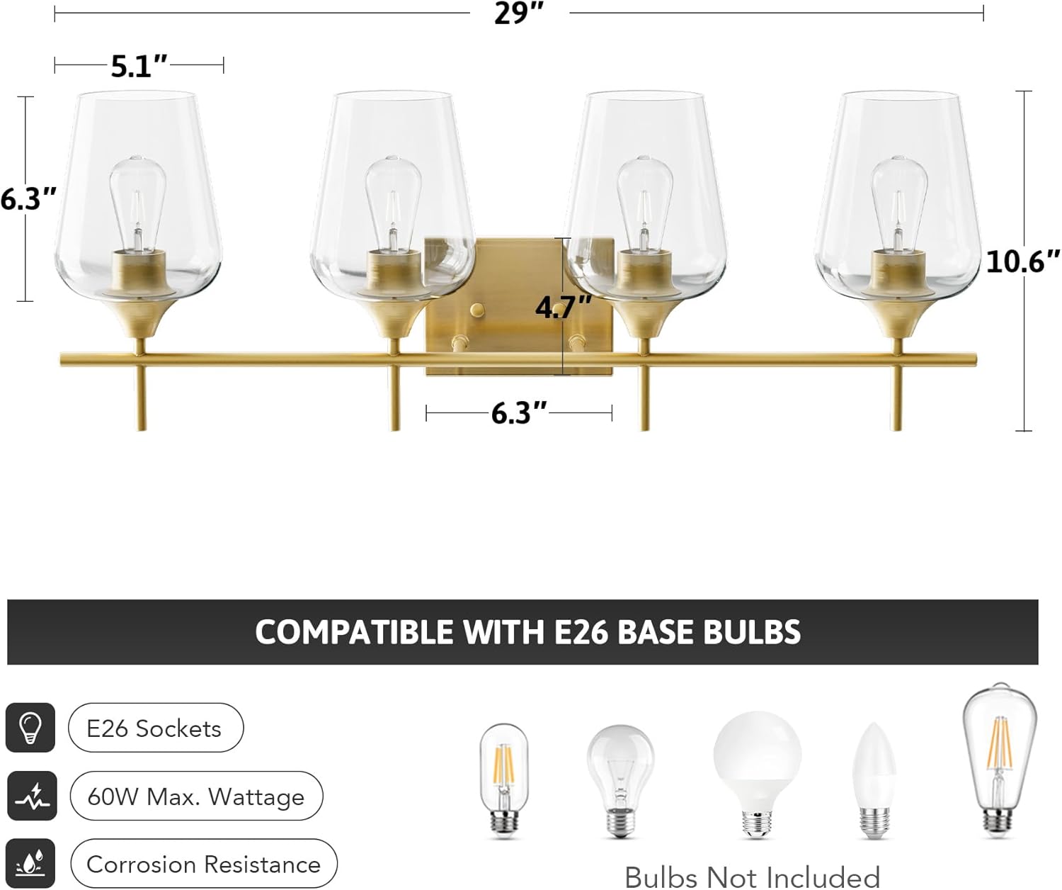 - Timeless Modern Design: This 4-light vanity light blends modern industrial style with minimalist elegance. Made with gold-finish metal and clear glass shades, it adds a sleek, contemporary touch to enhance any roomβs aesthetic