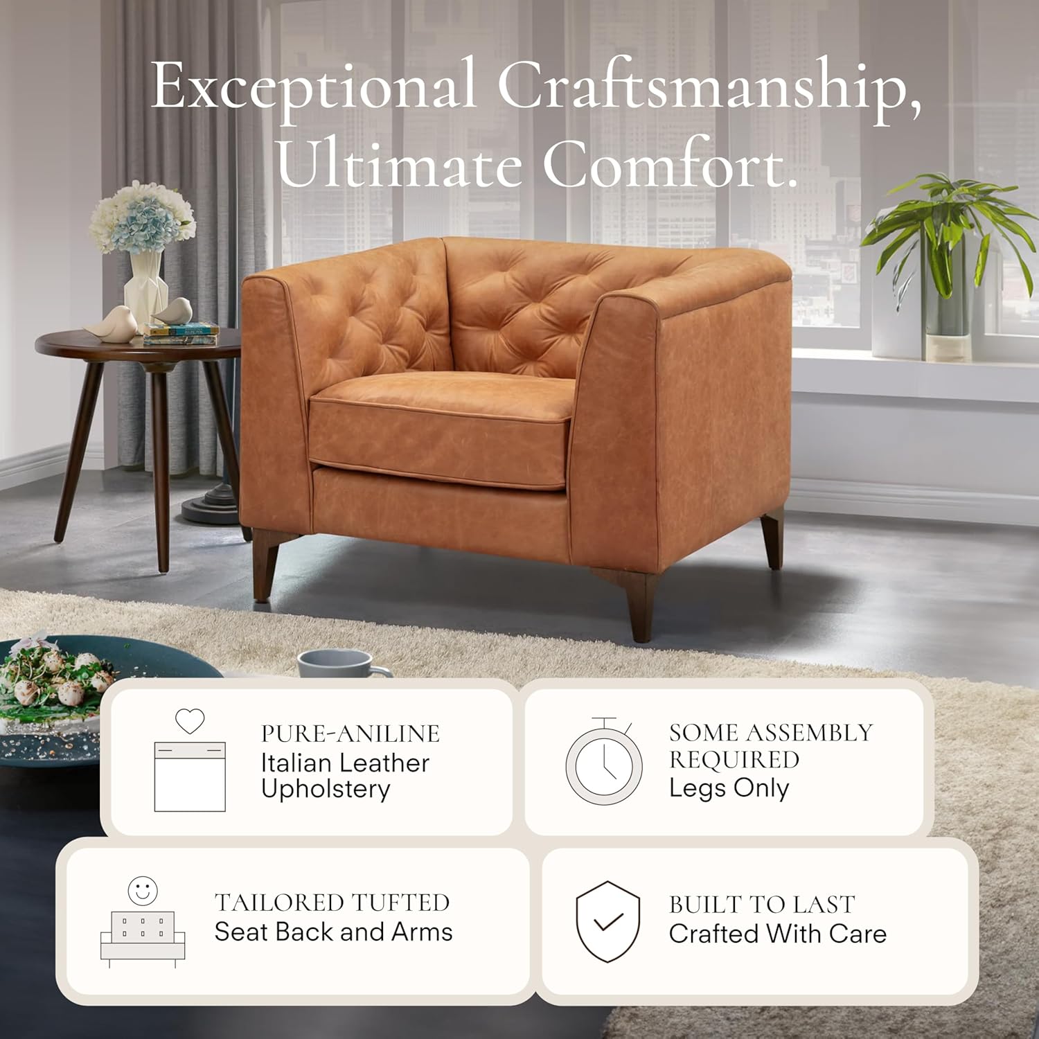 - Quality First Because Quality Lasts: Our full-grain pure-aniline Italian leather reading chair is designed with your comfort in mind, featuring a feather-down topper on seating surfaces, webbing support, and non-reversible cushions. Its solid wood legs with a walnut finish complement the cognac leather, making it an ideal chair for bedrooms or single chair for living rooms.