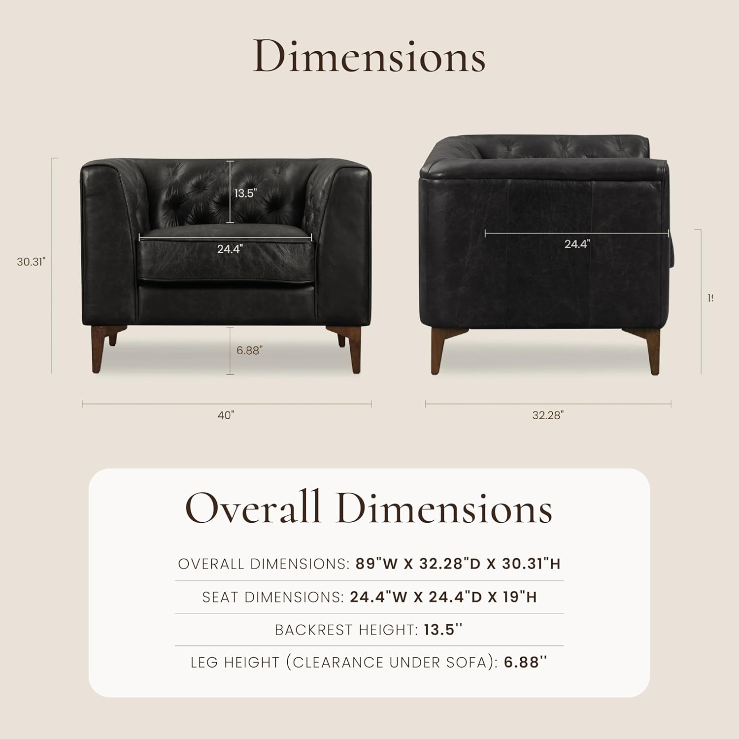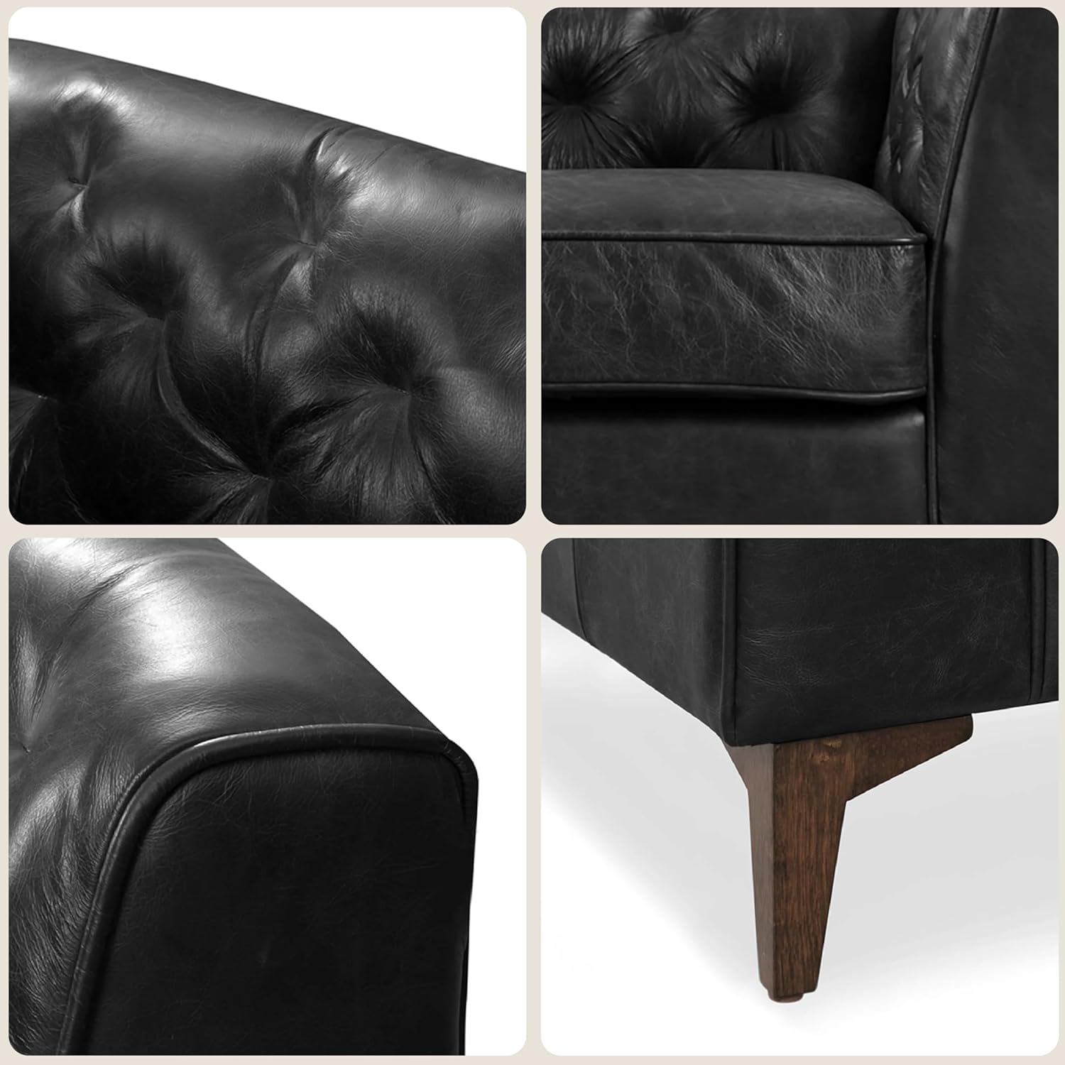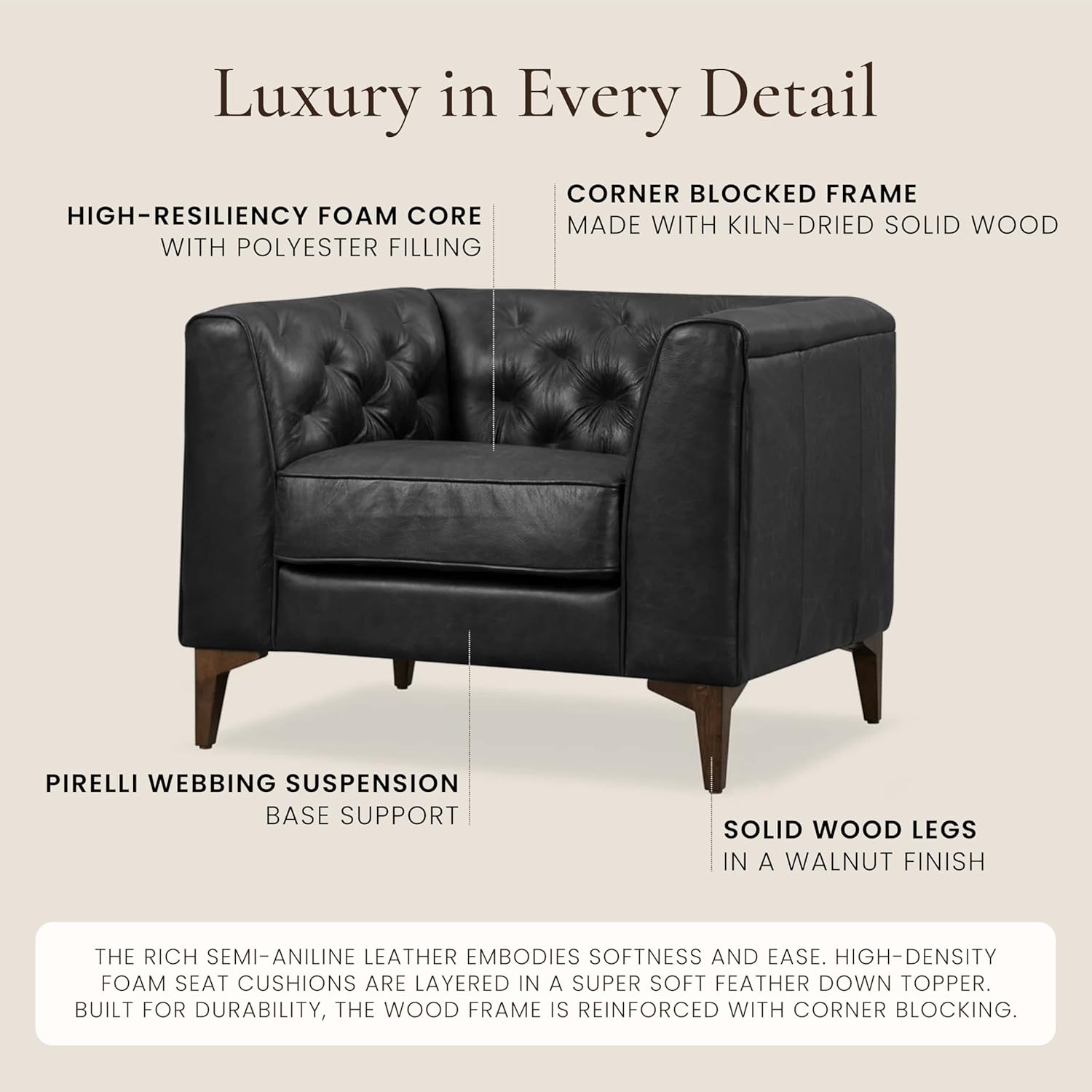 - Quality First Because Quality Lasts: Our full-grain pure-aniline Italian leather reading chair is designed with your comfort in mind, featuring a feather-down topper on seating surfaces, webbing support, and non-reversible cushions. Its solid wood legs with a walnut finish complement the black leather, making it an ideal chair for bedrooms or single chair for living rooms.