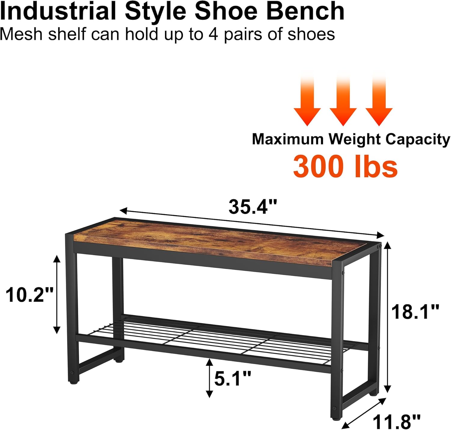 - STURDY SHOE BENCH WITH LARGE CAPACITY: Component of thicked metal frames and smooth MDF tabletop, this shoe bench can well hold 300lbs at the maximum. Depending on shoe size, this hallway bench can hold 3 to 5 pairs of shoes. There is also enough clearance between the shoe rack and the floor to store even more shoes.
