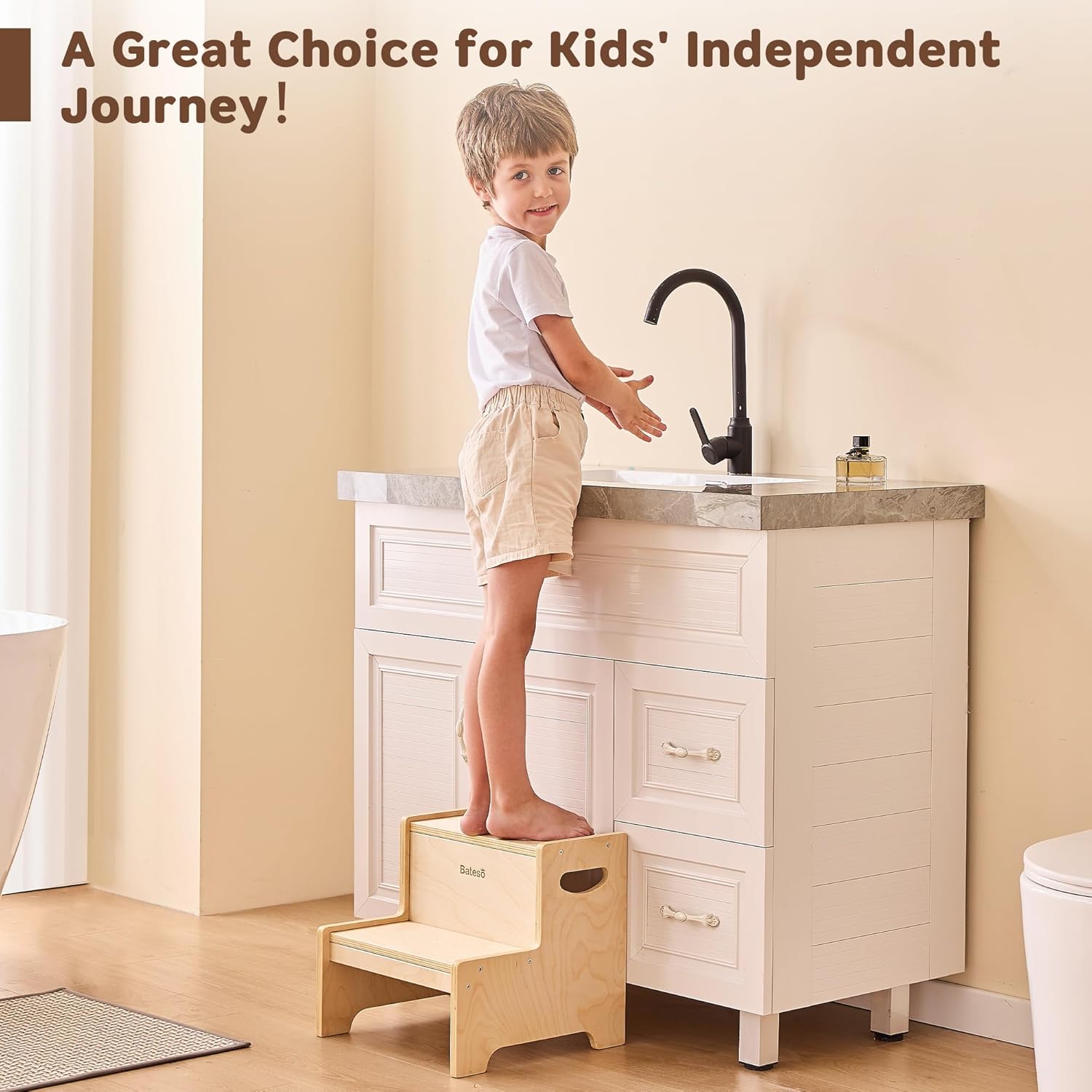 - PARTICIPATE IN DAILY TASKS: Our step stool is an important helper in toddlers' everyday tasks. It is suitable for toilets, bathroom sinks and kitchen counters. Kids can use this wooden step stool for potty training, tooth brushing and hand washing, fostering their independence and confidence.