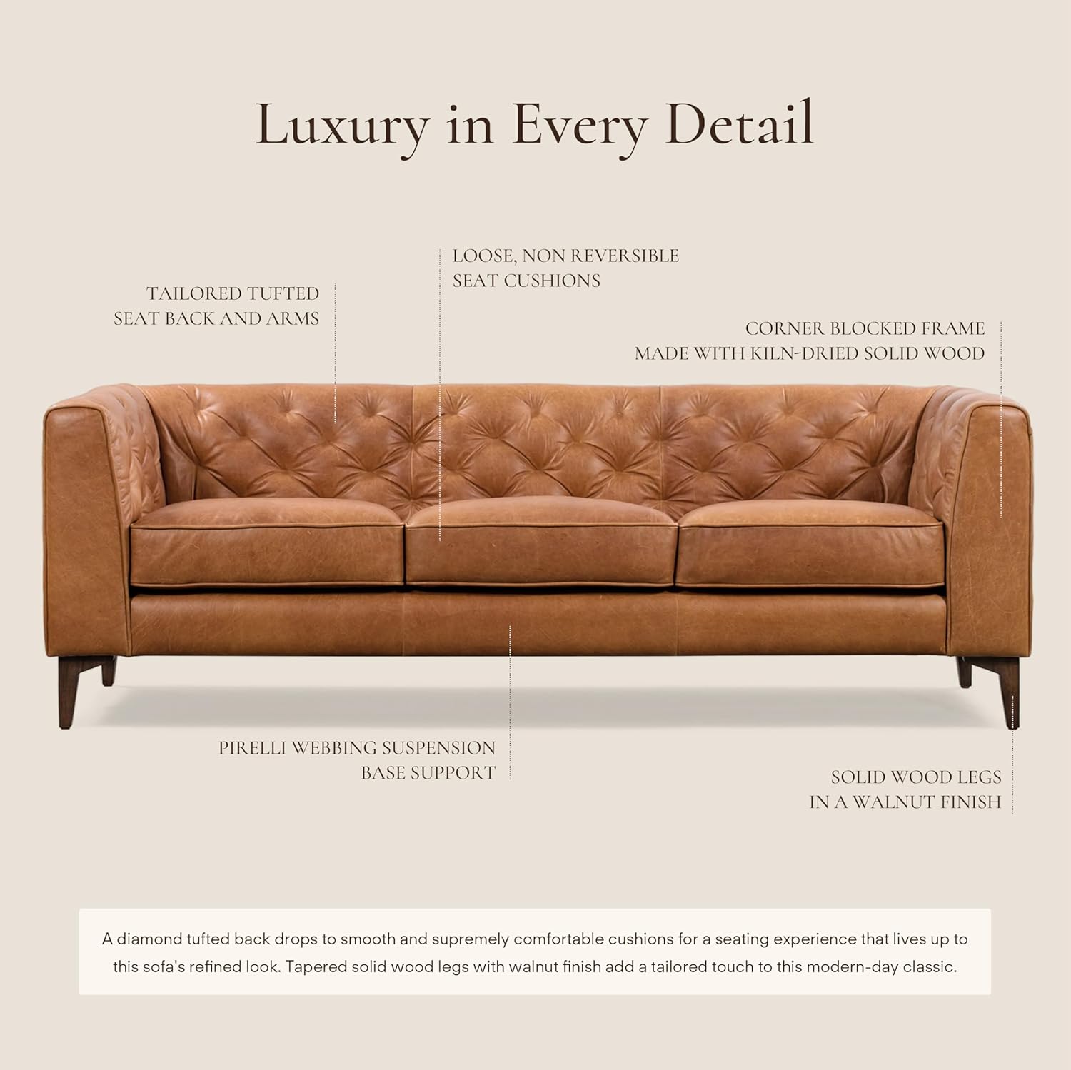 - Quality First Because Quality Lasts: Our full-grain pure-aniline Italian leather sofa is designed with your comfort in mind, featuring a feather-down topper on seating surfaces, Pirelli webbing support, and non-reversible cushions. Its solid wood legs with a walnut finish complement the cognac leather, making it an ideal office sofa or living room sofa.