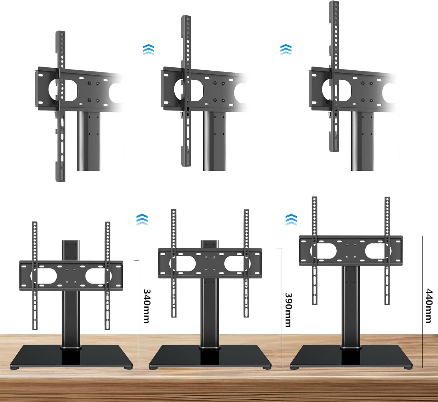 - 【HEIGHT ADJUSTABILITY】- Suptek mount universal cantilever table top tv stand has 3 positions to cater to various viewing habits and TV sizes. Lasting sleek design with tempered glass base 8mm thick tempered glass base measuring 415mm x 260mm.