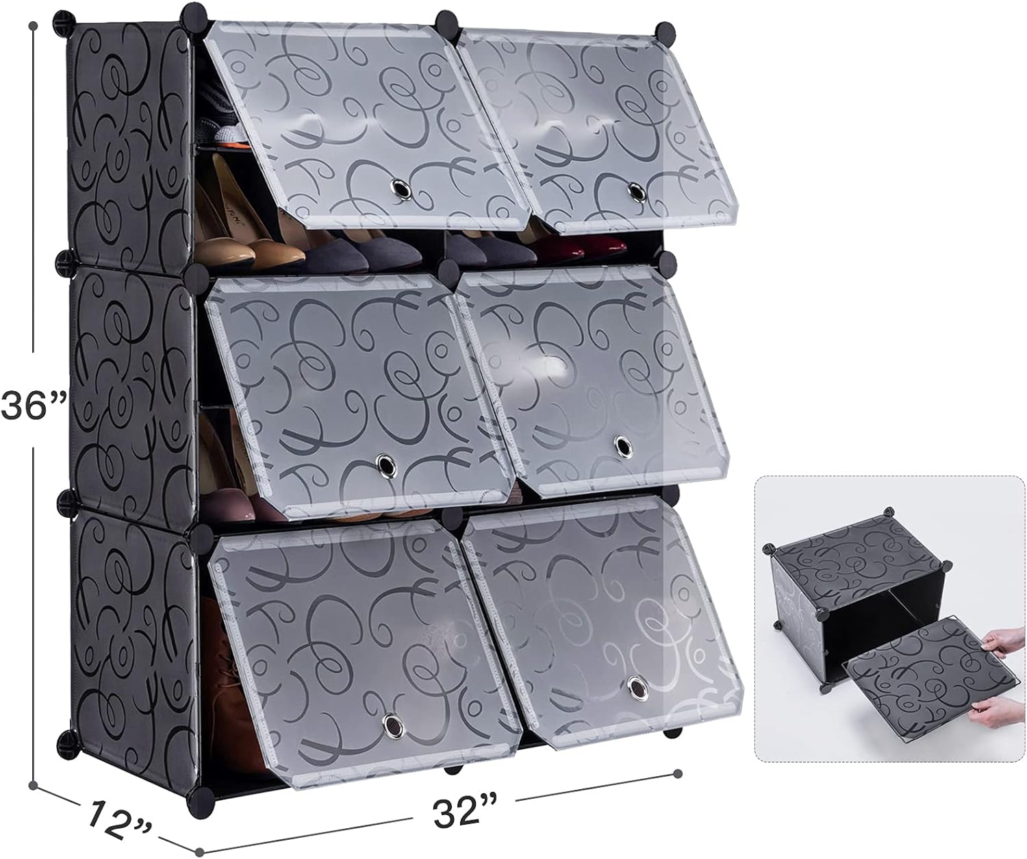 - 【Large Space】 Size: 32"(W) x 12"(D) x 36"(H). Each cube can support up to 22 pounds. The shoe rack helps you easily locate the shoes. Each cube can hold up to four pairs Adult shoes, suitable for use in your cloakroom, doorway or garage.