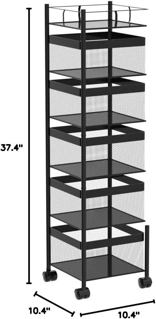 Fruit and Vegetable Basket for Kitchen No Assembly, Rotating Storage Rack,Bathroom Storage Shelf, Kitchen Organizers and Storage Cart on Rolling Wheels(Black, 5 Tier-Square)