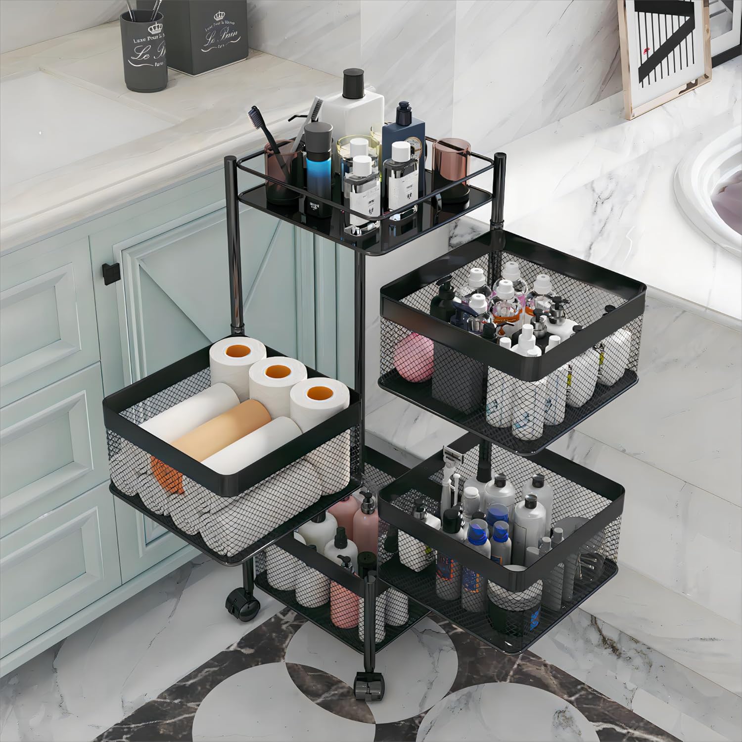 Rotating Kitchen Storage Rack,Bathroom Shelf,Kitchen Organization and Storage,Bathroom Storage Organizer,Fruit Basket,Rolling Carts with Wheels(Black, 4 Tier-Square)