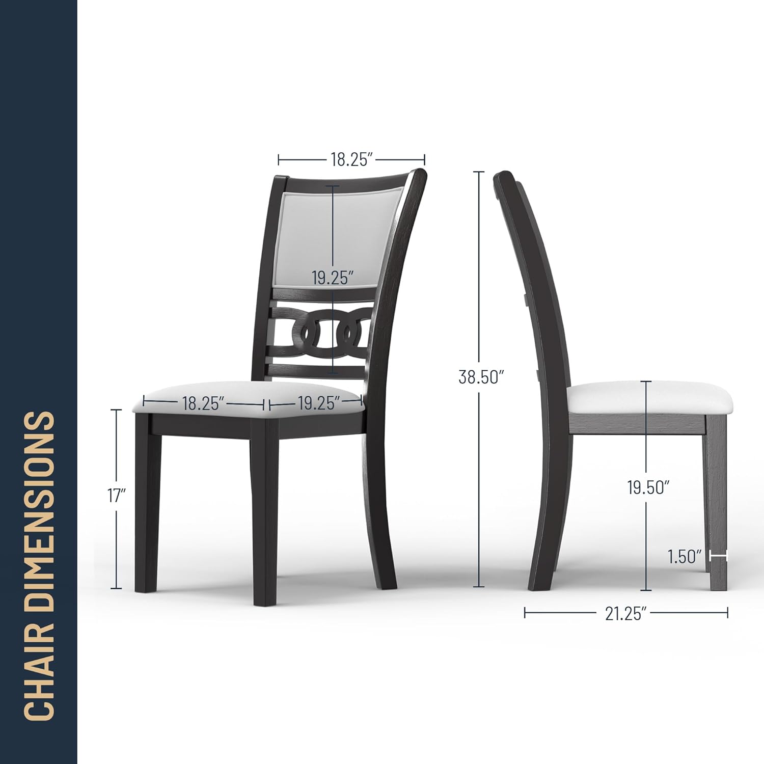 - 4 Dining Chairs: Upholstered Dining Chairs constructed of Solid Wood with Padded Seats and Backs in Coordinating Light Gray Polyester Fabric.