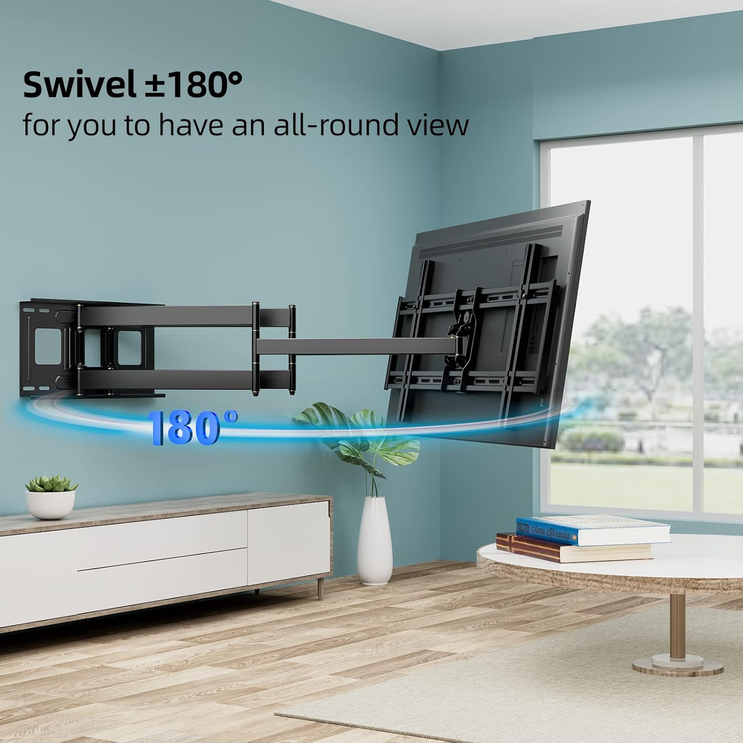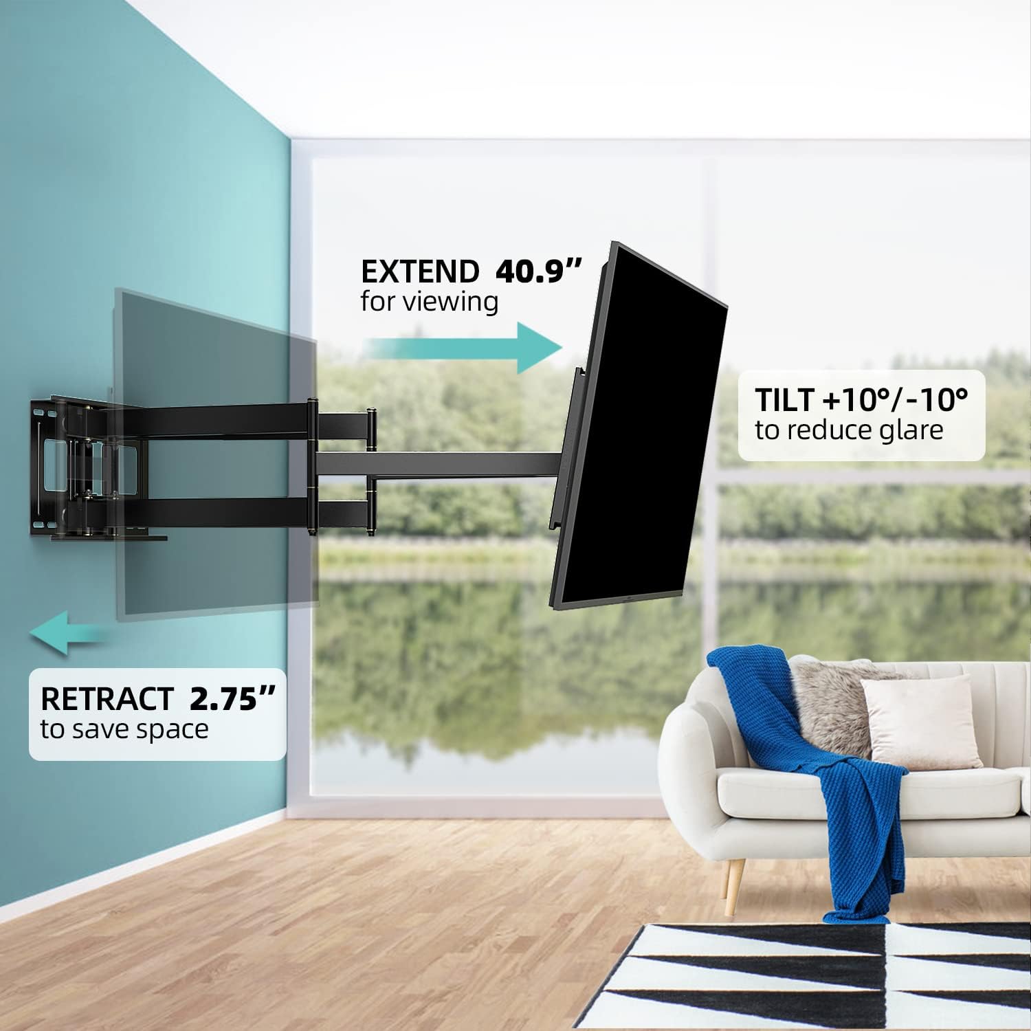 - 40.9 INCH ARTICULATING TV WALL MOUNT: Maximize your viewing flexibility with this ultra-long extension mount. It smoothly retracts to a slim 2.75" profile and extends a full 40.9" from the wall, allowing you to effortlessly position your TV for the perfect view from anywhere in the room and easily navigate around corners or built-in cabinets/obstructions. This makes it the ideal solution for corner placements or challenging spaces with cabinetry.