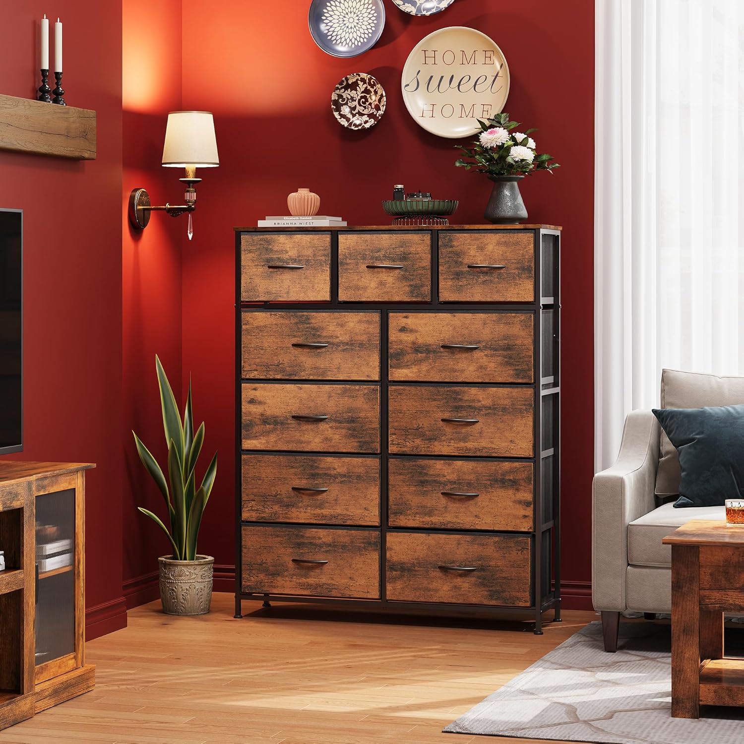 WLIVE Storage Organizer Unit with 11 Fabric Bins, Storage Drawers Organizer with Steel Frame, Tall Storage Tower Organizaton for Living Room, Hallway, Office, Rustic Brown