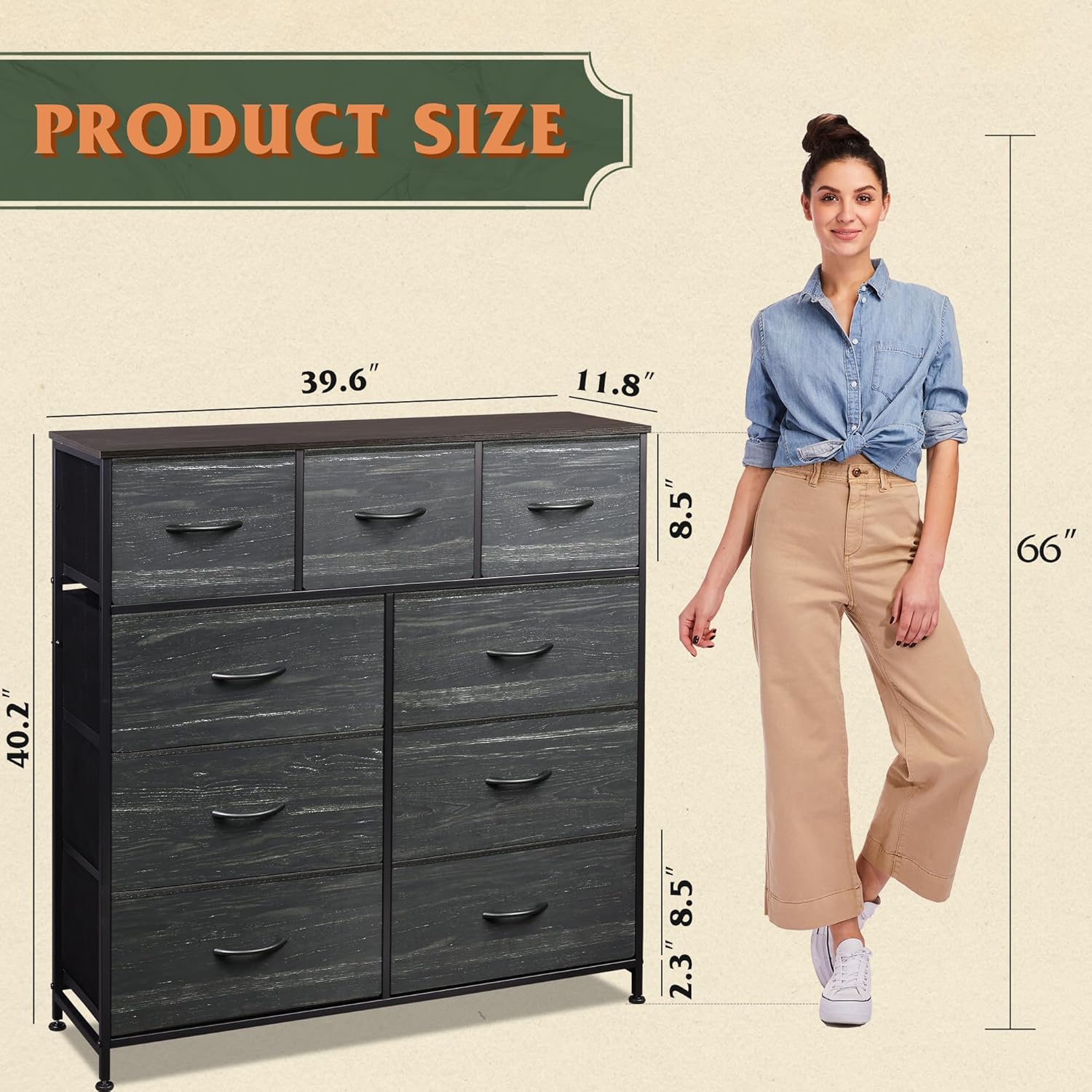 - Roomy Storage Space: The 9 foldable deep drawers are so spacious that they provide endless organizational possibilities. Wooden top is great for lamps, clocks, glasses and other daily essentials, keeping them in your reach.