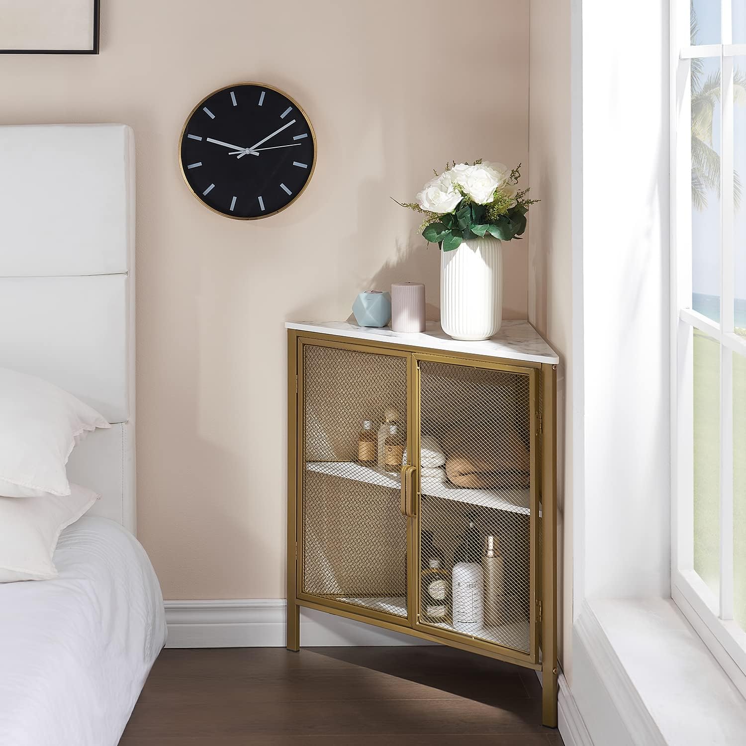 VECELO Corner Cabinet/Table, 3-Tier Shelves with Protection Door, Metal Frame Storage Shelf Organizer for Small Space, Living Room, Kitchen, Bathroom, Set of 1, Gold