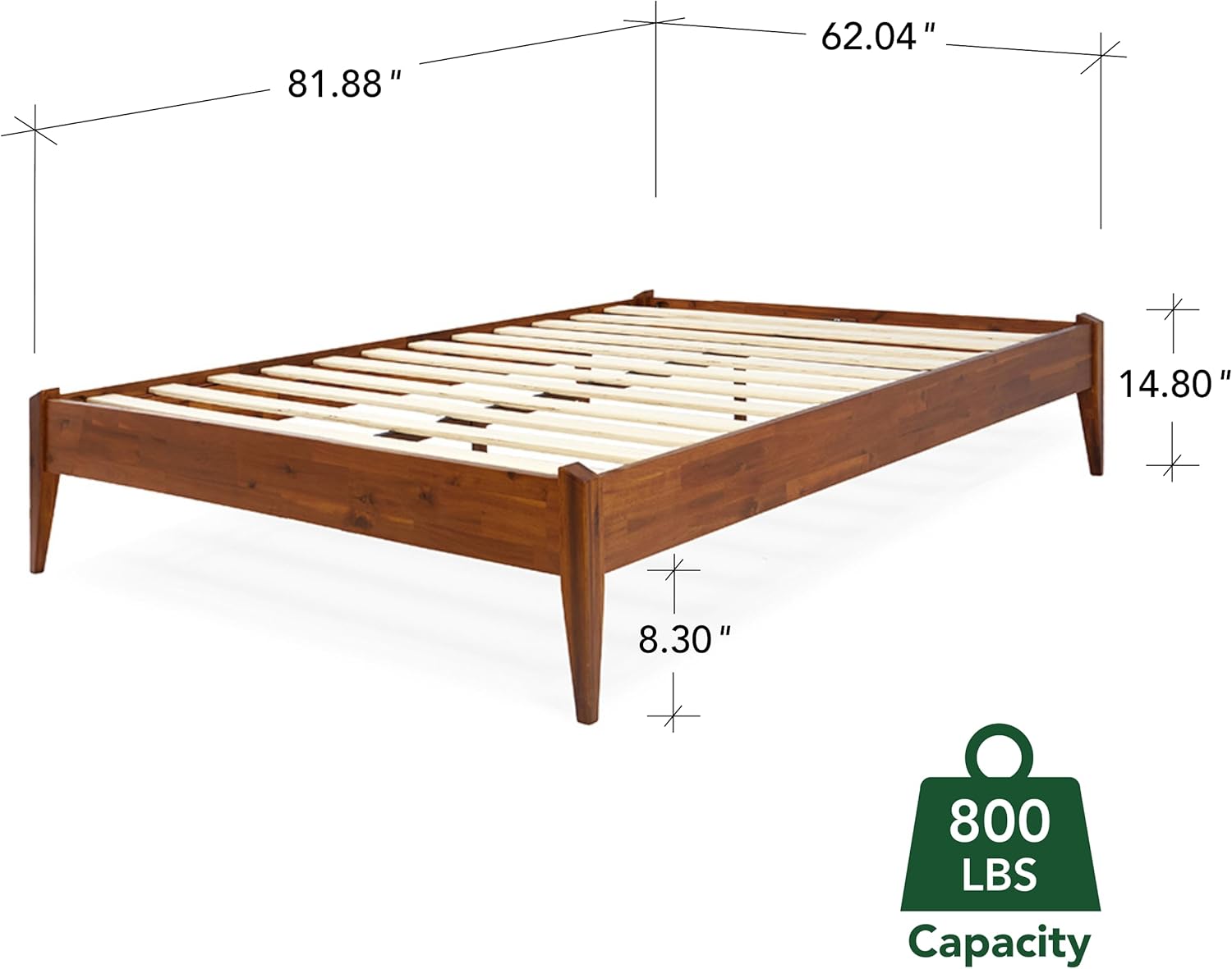 - DURABLE SOLID DESIGN: The solid queen bed frame wood without headboard is made from solid wood platform bedframe queen-size with a thick wooden frame and tapered leg design for a strong and elegant feel; Power coating iron frame helps to increase the durability of the product; Supporting up to 800 pounds for King japanese joinery bed frame, Queen bed frame wood, Full platform bed frame and 350 pounds for Twin minimalistic bed frame