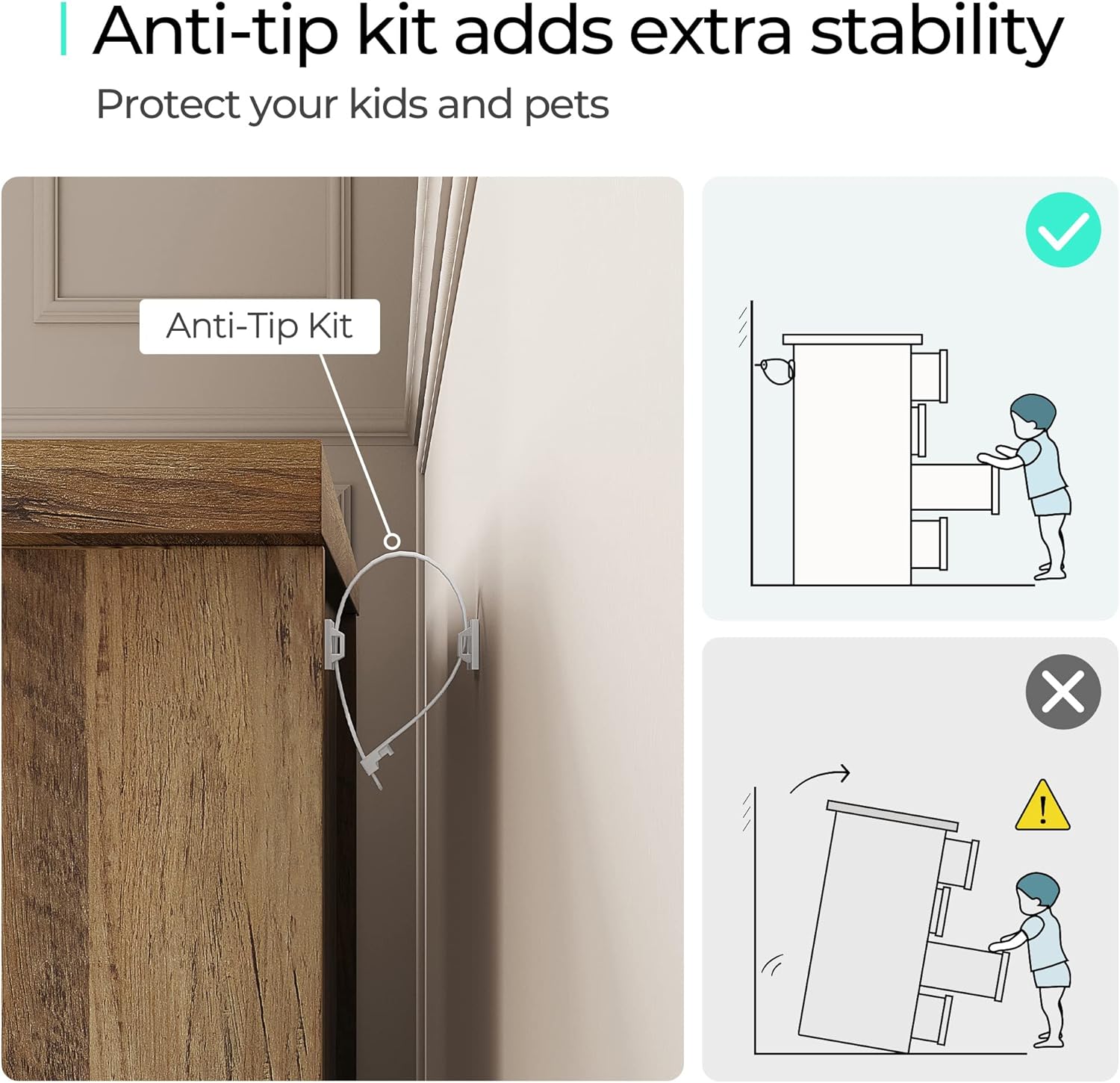 - No Tip, No Trip: We're all about safety, because who needs furniture-induced injuries? Our anti-falling accessory is like a trusty sidekick, preventing unexpected furniture acrobatics. And just when you thought we were done, we've got your back – literally. Our stabilizing device is like the ultimate wing-man, making sure your dresser stays upright and unshaken.