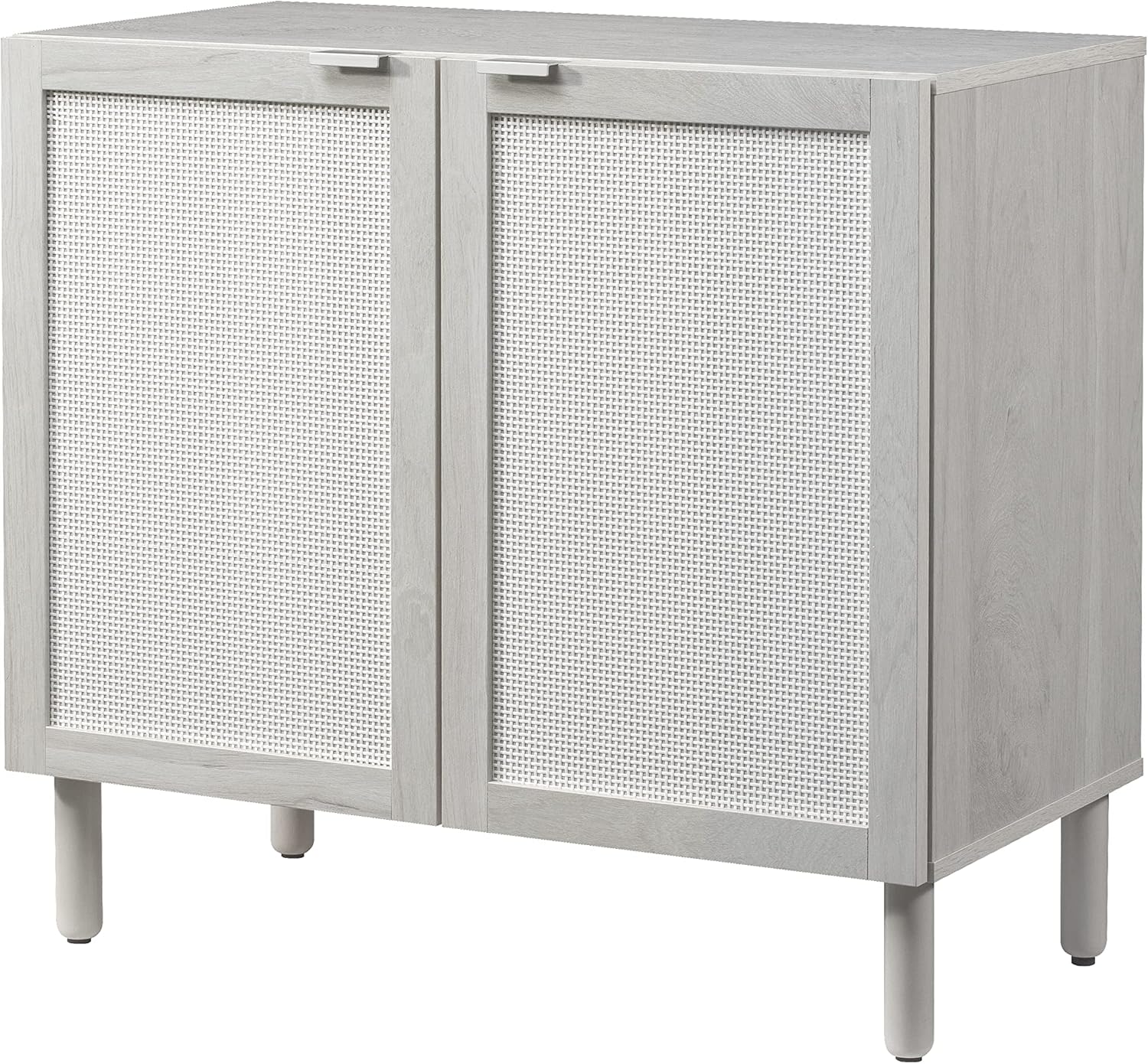 Sango Orre 2-Door Cabinet, Modern White Storage Cabinet with Synthetic Rattan Door Panels, Adjustable Shelf, Cylindrical Wood Legs, Discreet Finger Pulls, Elegant Furniture for Office or Living Room