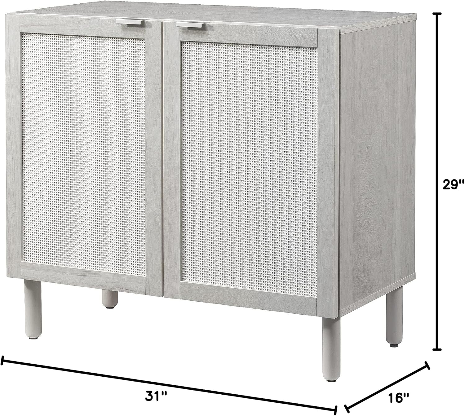 - 【 EXQUISITELY CRAFTED】: Measuring 30"W x 14.5"D x 29"H, this Sango Orre 2-Door Cabinet in white features a glazed finish with synthetic rattan doors and cylindrical wood legs. Discreet metal pulls add modern flair, ideal for living or office rooms.