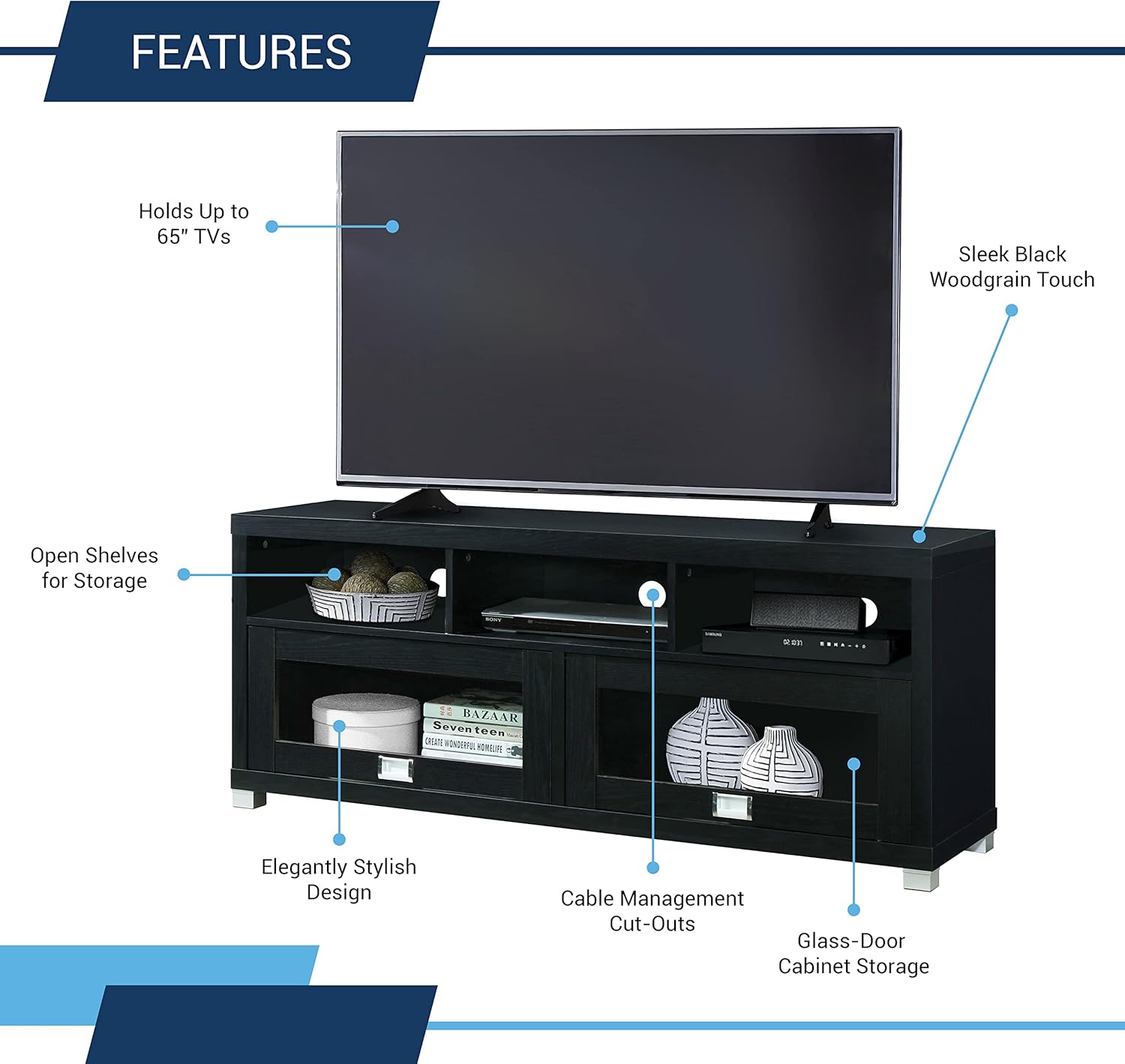 - Maximize Your Space: We designed our slim tv stand for living room storage organization. Our media stand features under TV cabinet storages, and shelves with back panel openings. Save more space with our TV cabinets with doors and shelves.