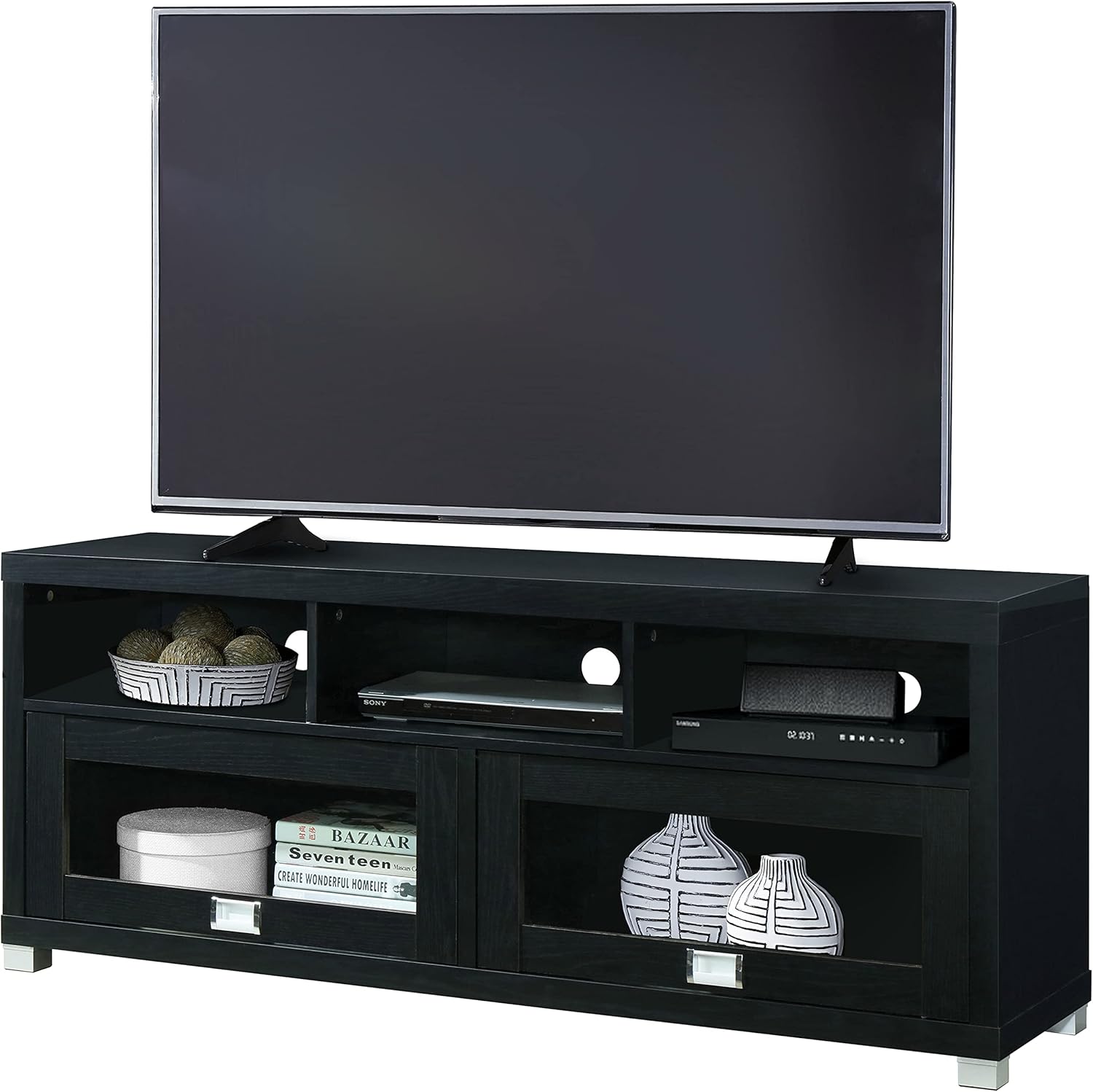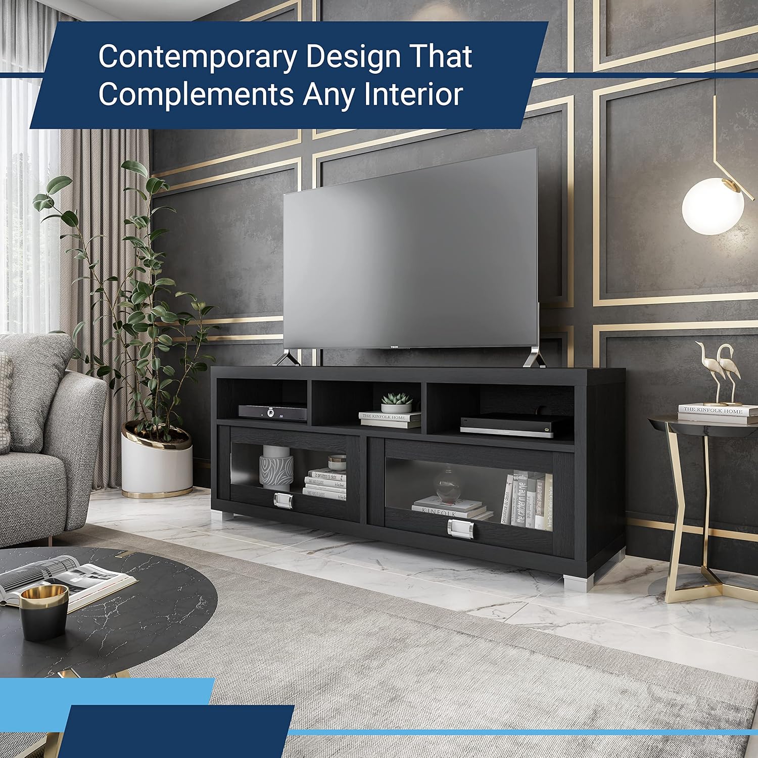 - Secure Your TV & Media Furniture: End your search for a universal TV stand with storage with our TV console table made with heavy-duty compressed wood, engineered to have a solid structure that gives you a media cabinet with higher weight capacity and durability.