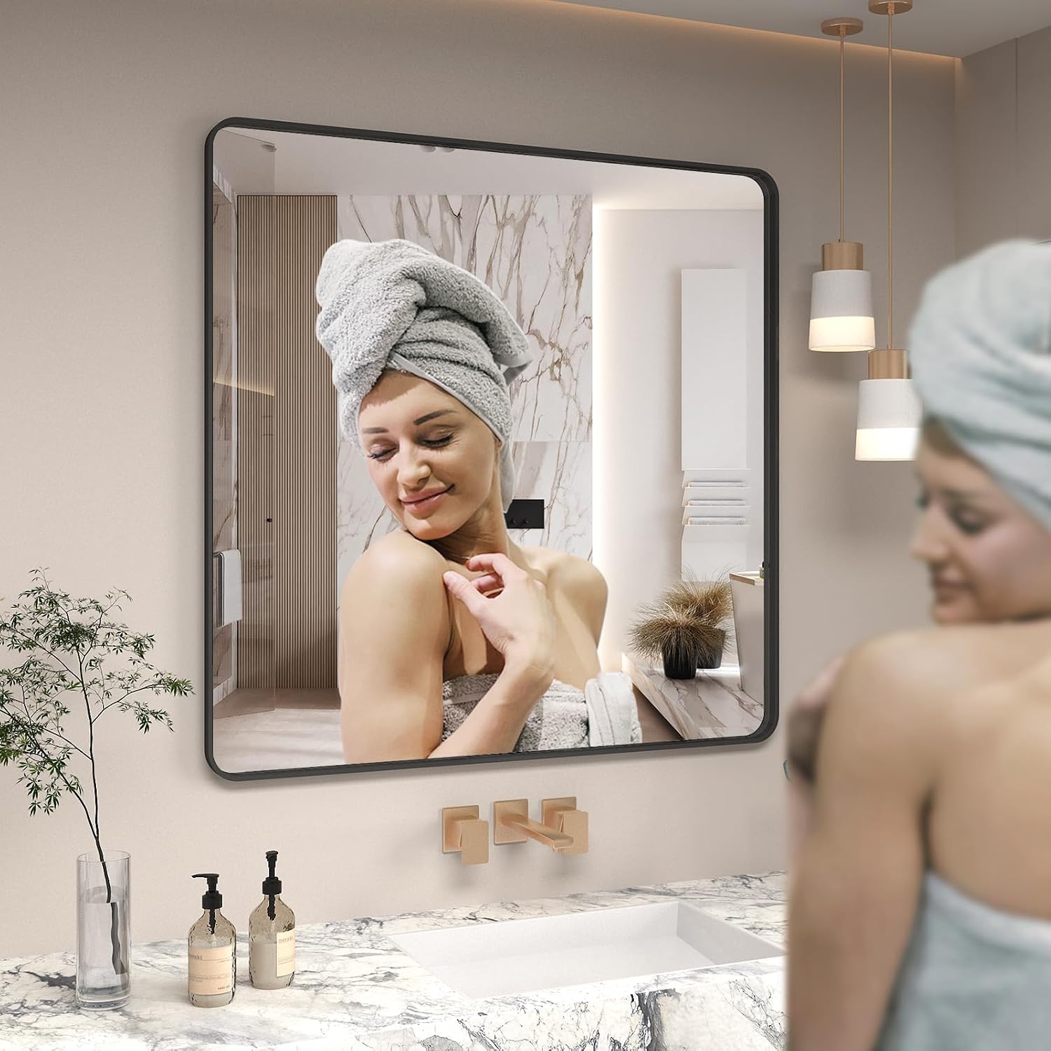 36x36 Square Black Bathroom Mirror, Matte Framed Bathroom Vanity Mirror for Wall, Modern Rectangle Mirror, Rounded Corners, Tempered Glass