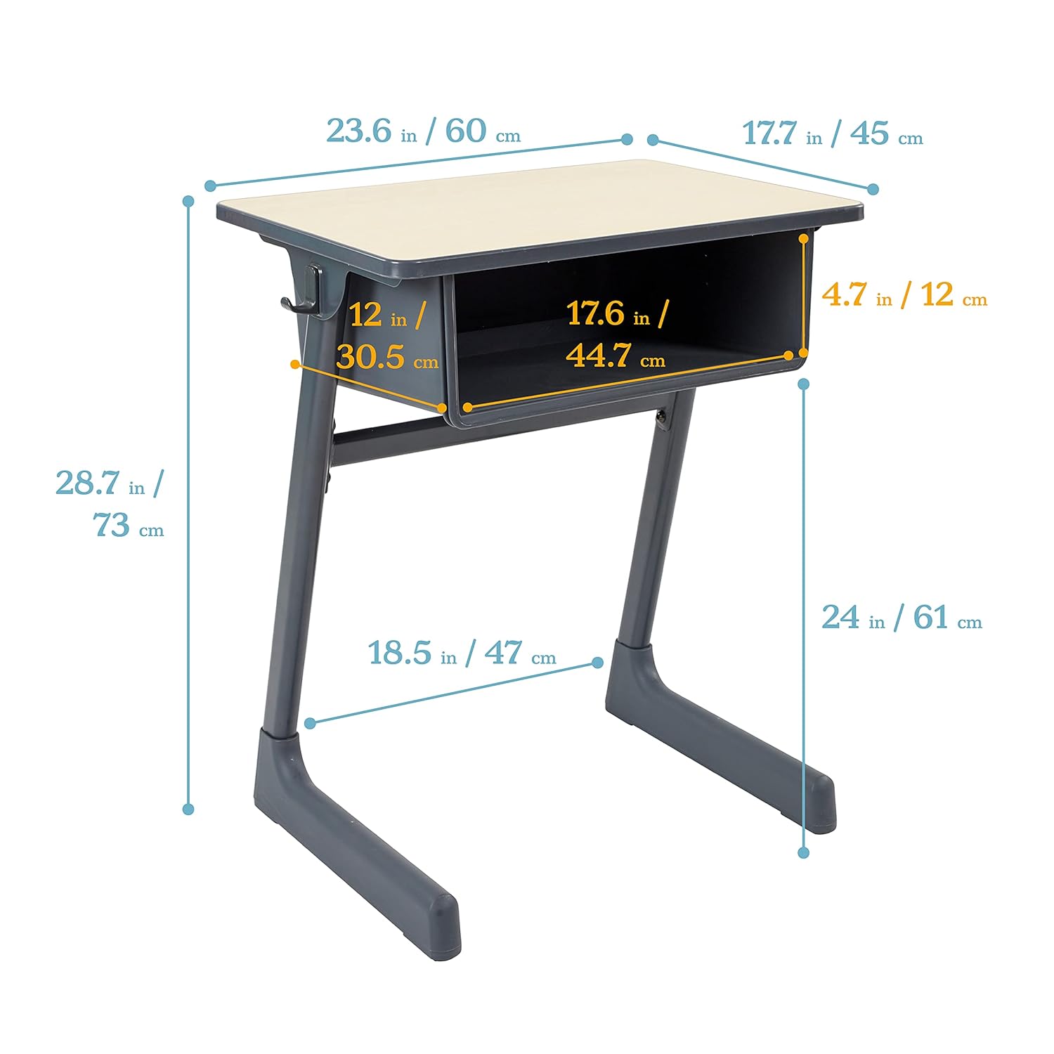 - Dimensions and Care: Assembled desk measures 23.6" L x 17.7" W x 28.7" H; clean with a mild soap-and-water solution or with your favorite bleach-free cleaning wipe