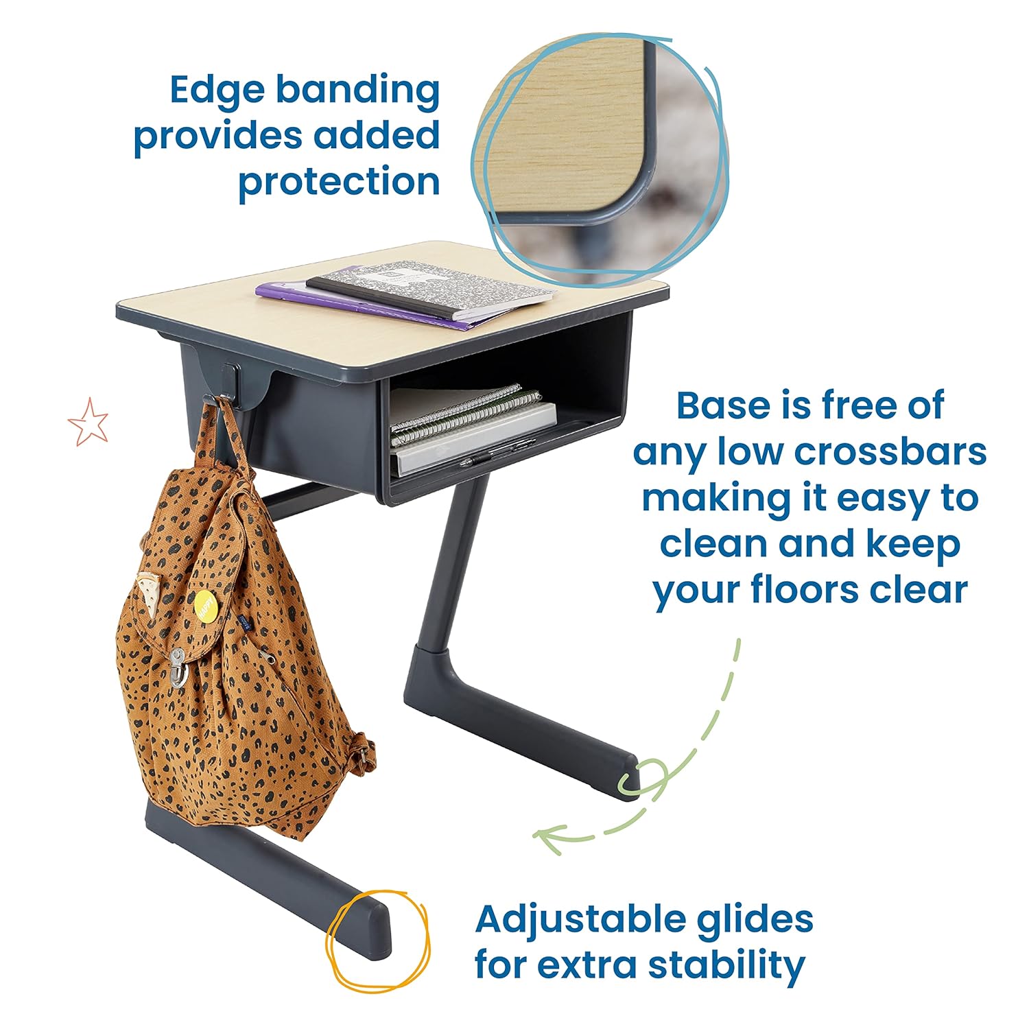 - Durable Materials: Great for use in schools, classrooms, homes and kids' rooms, the durable desk top resists stains and scratches and is sealed with a liquid-tight edge banding