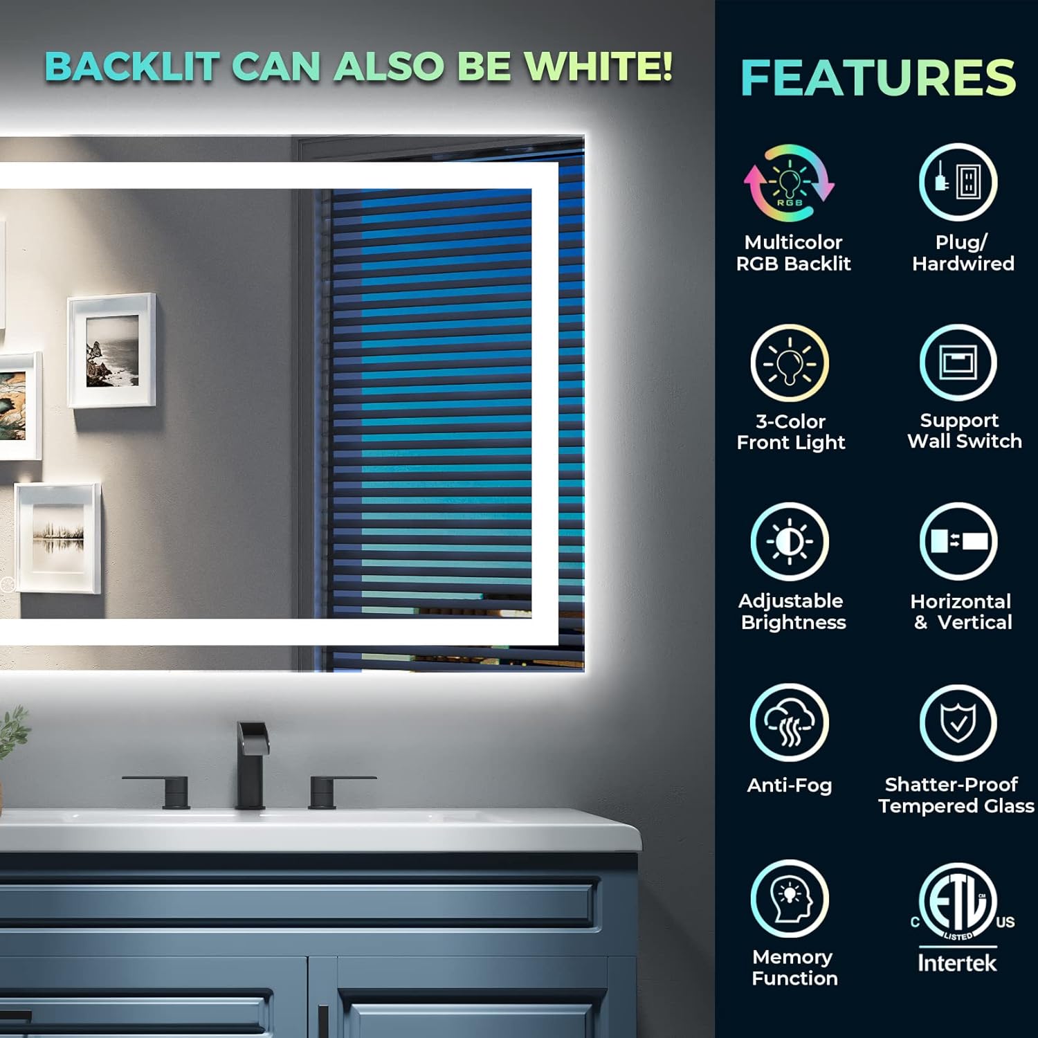- 💎【3+8 Light Colors, Make a Difference】- This led mirror for bathroom has 3 front light modes: warm(3000K), white (4000K) and cold (6000K). RGB backlit has 8 light modes: warm / white / cold / flowing colorful / purple / red / green / blue. THE BACK LIGHT CAN BE WHITE ONLY! The muli color tone options are what makes this led vanity mirror and what makes your bathroom truly difference.