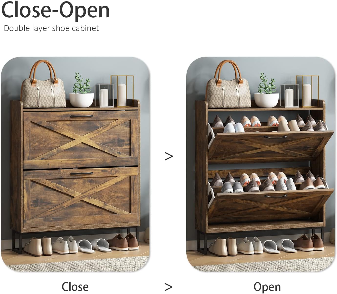 - Entryway Shoe Cabinet: The hidden shoe storage cabinet with 2 flip doors, stylish and simple rustic brown makes it a neat and beautiful finish and looks great in many different home styles. Perfect for placing in the entryway, hallway, living room, or porch, provides a neat looking in your home and space saving