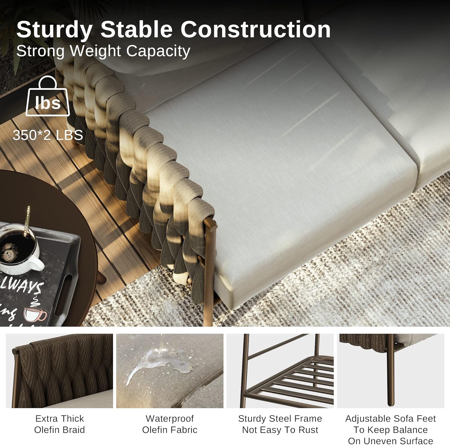 - PREMIUM MATERLIAL FOR LASTING USE:Our patio sofa is braided from delicate Olefin wide rope and has a strong visual sense and good comfort. The Olefin cushion cover comes with TPU coating treatment, and is stitched with encrypted Teslin which is waterproof and breathable. Compared with ordinary ratten materials, the Olefin fabric is thoughtfully crafted and built to withstand the extremes weather, has features of better touch, wear resistance and good color fastness to meet the outdoor use requirements. All durable performance is designed to ensure long-lasting comfort