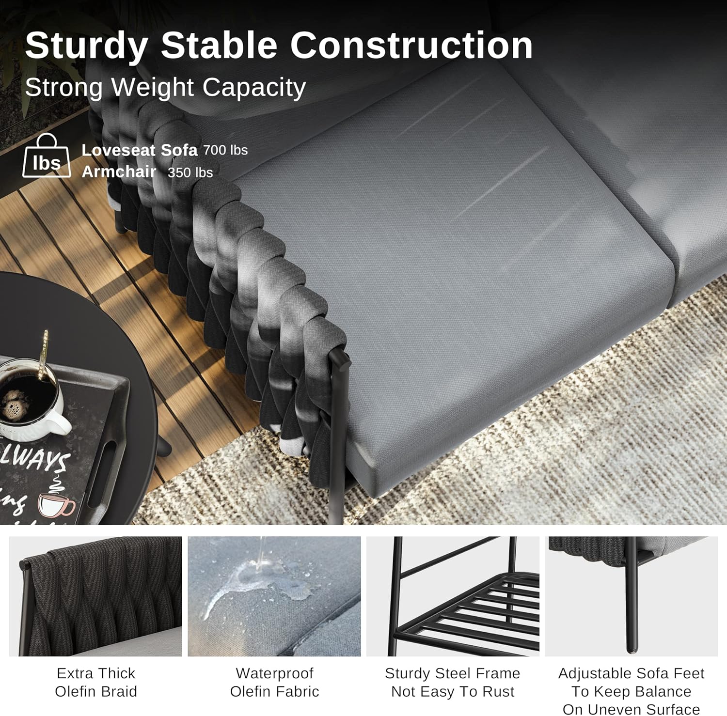- STRONG BEARING CAPACITY DESIGN: Made of high-quality iron frame, after electrophoresis and plastic spraying treatment, it has good rust and weather resistance. Loveseat sofa can provide a high load-bearing capacity of 700 lbs and two armchairs: 700 lbs.