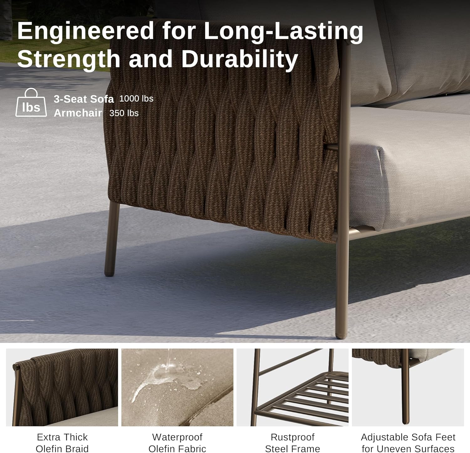 - PREMIUM MATERIAL FOR LASTING USE: The side material is constructed from woven Olefin rope, offering a modern, long-lasting look. The Olefin cushion covers are treated with a TPU coating and stitched with waterproof Teslin. Compared to ordinary rattan materials, the Olefin fabric is thoughtfully crafted to withstand extreme weather, offering improved wear resistance and color fastness to meet the outdoor use requirements of all four seasons