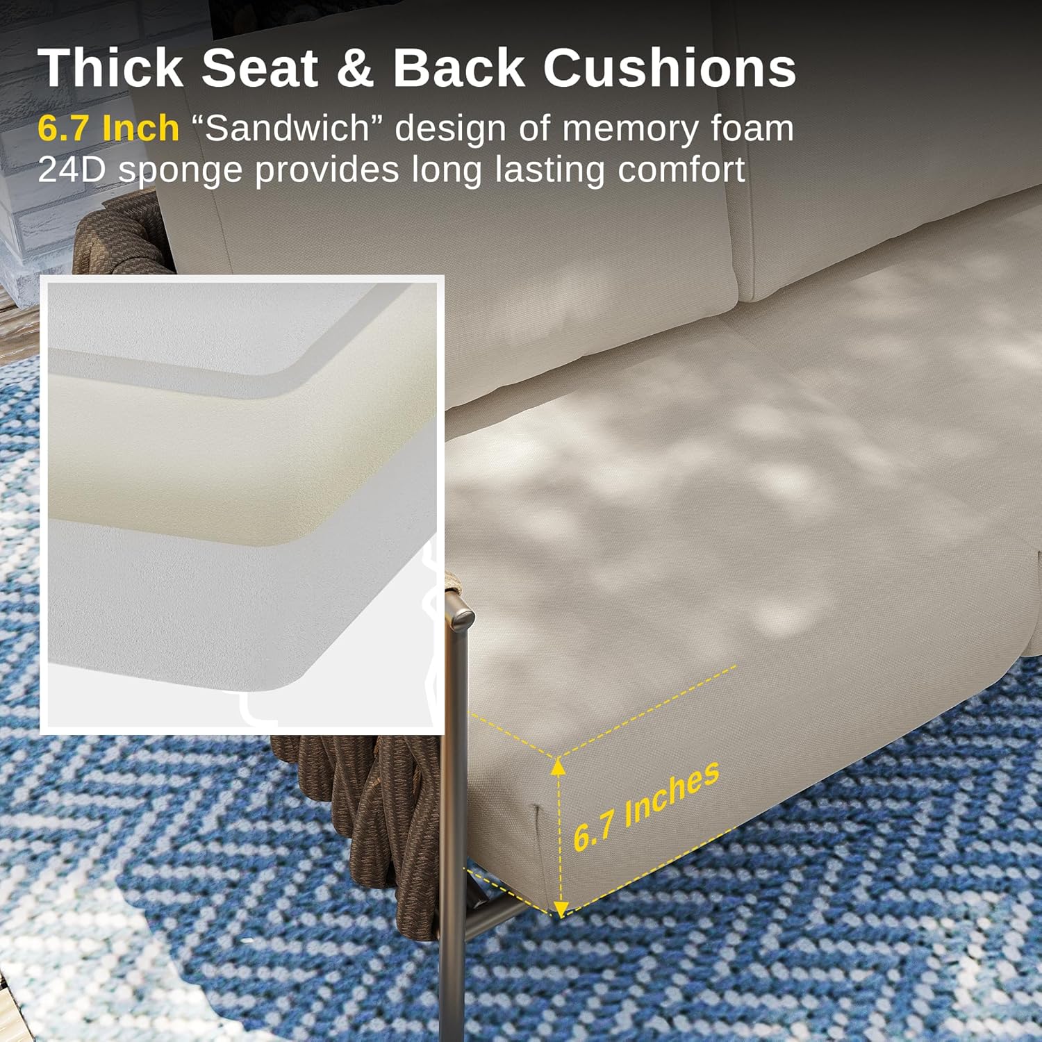 - EXTRA THICK-SEAT & BACK CUSHIONS: The padded seat and back cushions of the EAST OAK 5-piece patio furniture set comprise 6.7-inch high-quality and long-lasting memory foam that retains its shape after use. This is the one couch that provides long-lasting comfort well into the evening. The cushion covers are machine washable and can be removed for easy cleaning, making them look new