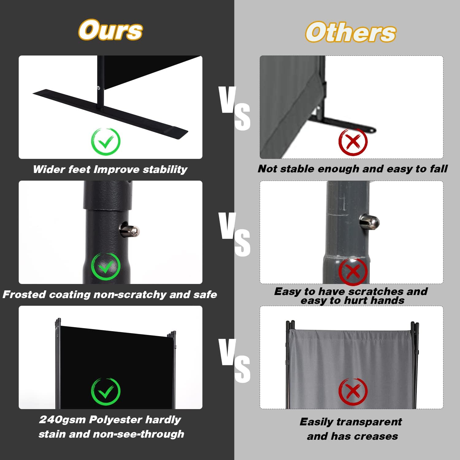 - Upgrades of materials: The panel of wall divider are made of watertight, non-see-through and tear-resistant high density 240g polyethylene fabric . The metal frame of the room divider wall is made of strong iron and powder coating, which increases its rust and wear resistance, and also extends his service life. At the same time widened support feet also increase its stability