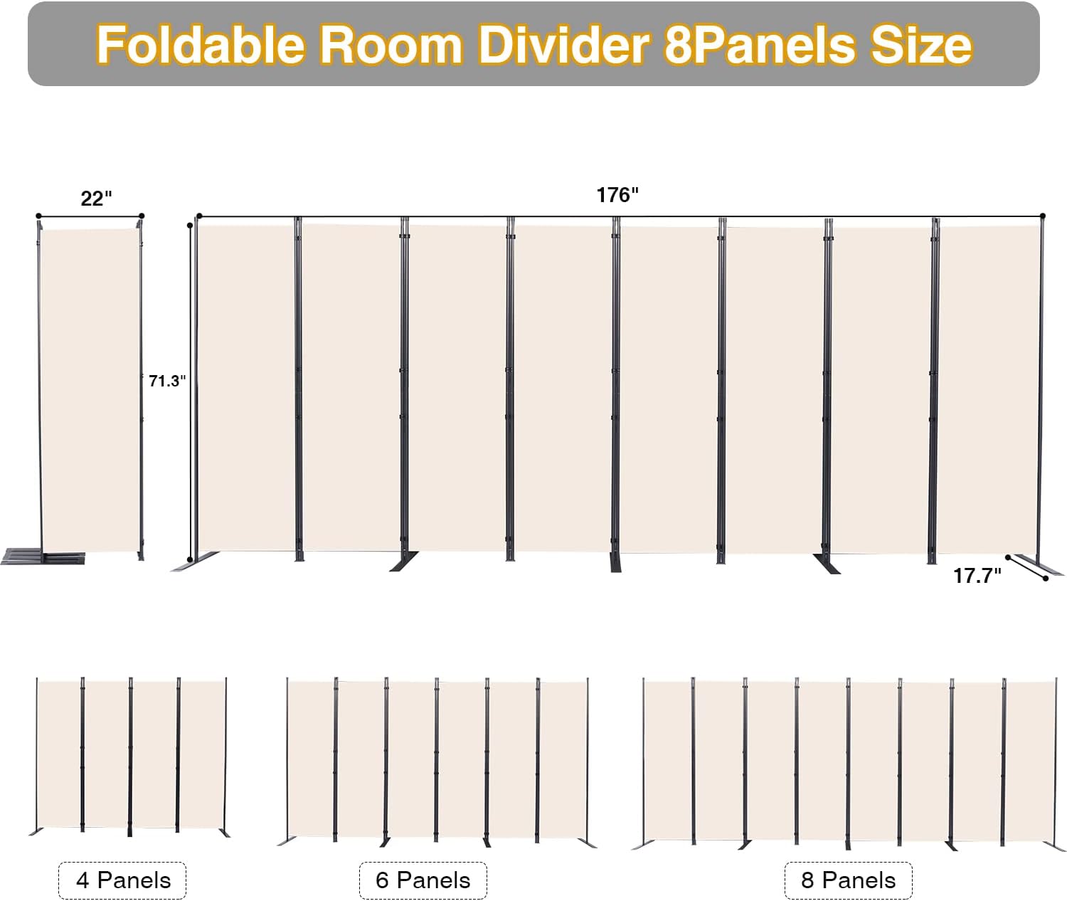 Room Divider, 8 Panel Folding Privacy Screens with Wider Support Feet, 6 Ft Portable Room Partition for Room Separator, 176" W X 71" H, Beige