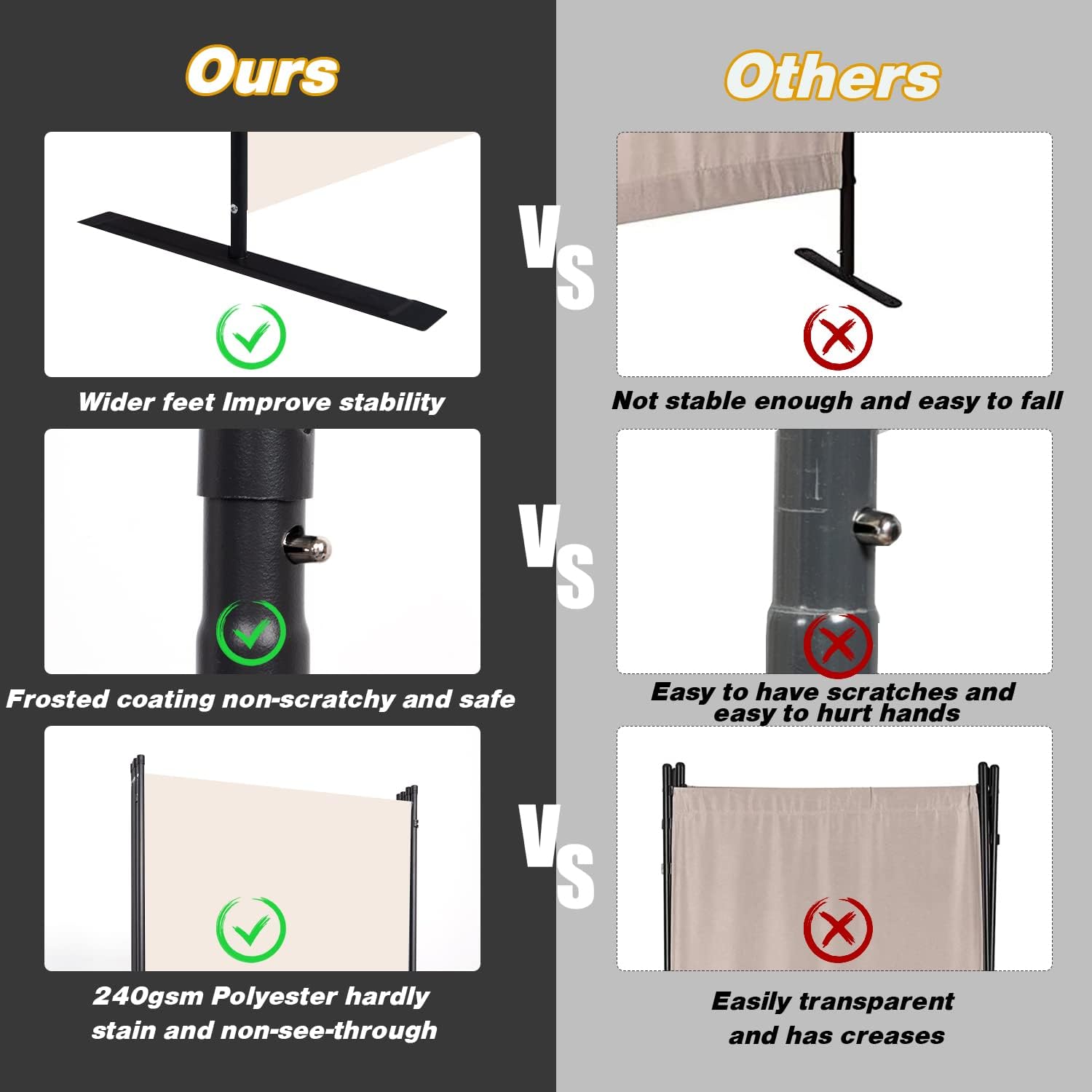 - Upgrades of materials: The panel of wall divider are made of watertight, non-see-through and tear-resistant high density 240g polyethylene fabric . The metal frame of the room divider wall is made of strong iron and powder coating, which increases its rust and wear resistance, and also extends his service life. At the same time widened support feet also increase its stability