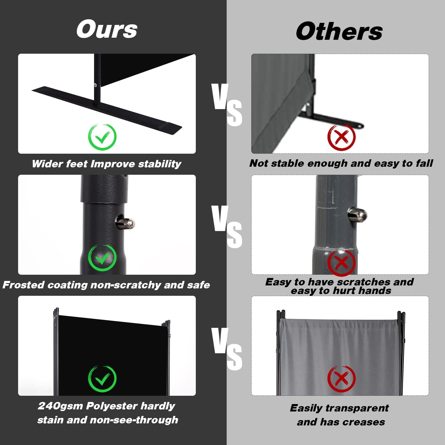 - Upgrades of materials: The panel of wall divider are made of watertight, non-see-through and tear-resistant high density 240g polyethylene fabric . The metal frame of the room divider wall is made of strong iron and powder coating, which increases its rust and wear resistance, and also extends his service life. At the same time widened support feet also increase its stability