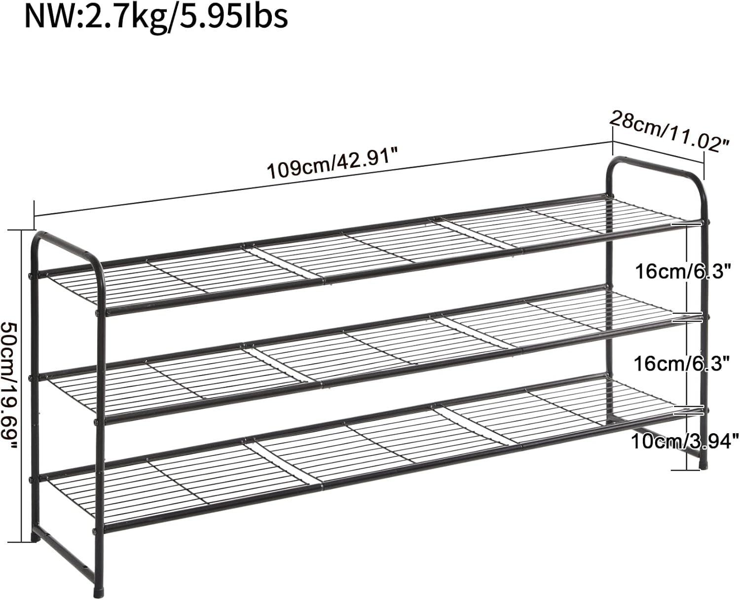- Large Capacity: Longer than other normal shoe rack on the market, easily store more pairs of shoes for men, women and kids, with enough storage space for high heels, sneakers, sandals and boots etc; Additional space at the bottom for slippers. Product Size: 42.9*19.7*11"