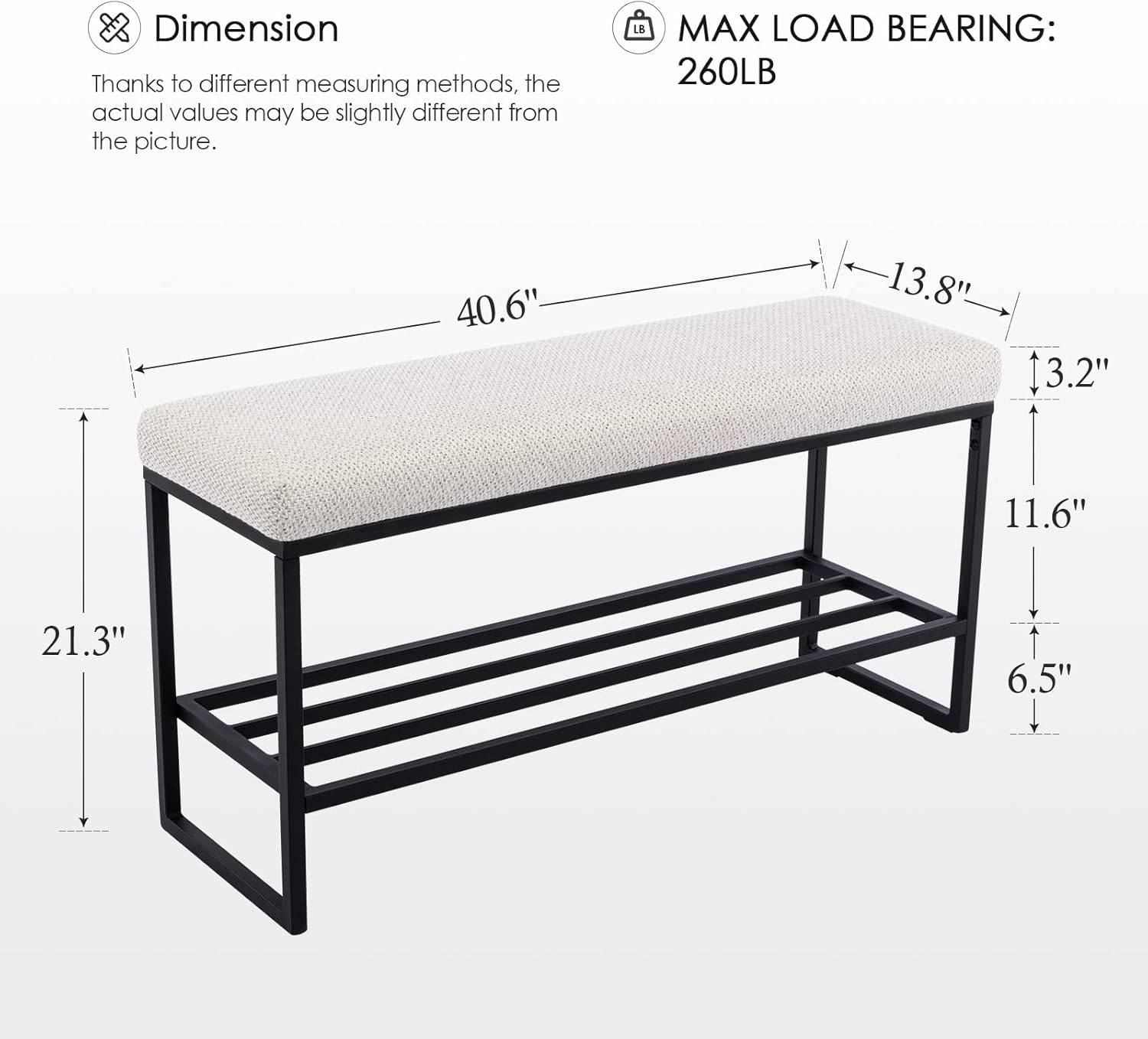 - âMEET DIVERSIFIED DEMANDS: The shoe bench takes into account both functionality and comfortable sensation, which is a practical combination of shoe rack and sofa, accommodating up to 5 pairs of various styles shoes being because of its ideal size of 40.6"Lx13.8"Wx21.3"H, giving you a soft sofa being due to 3.2" thickness of cushion. Simultaneously 11.6" height for meeting your demand to deposit taller shoes. Although insignificant to place in home but essential enough to change your lifestyle.