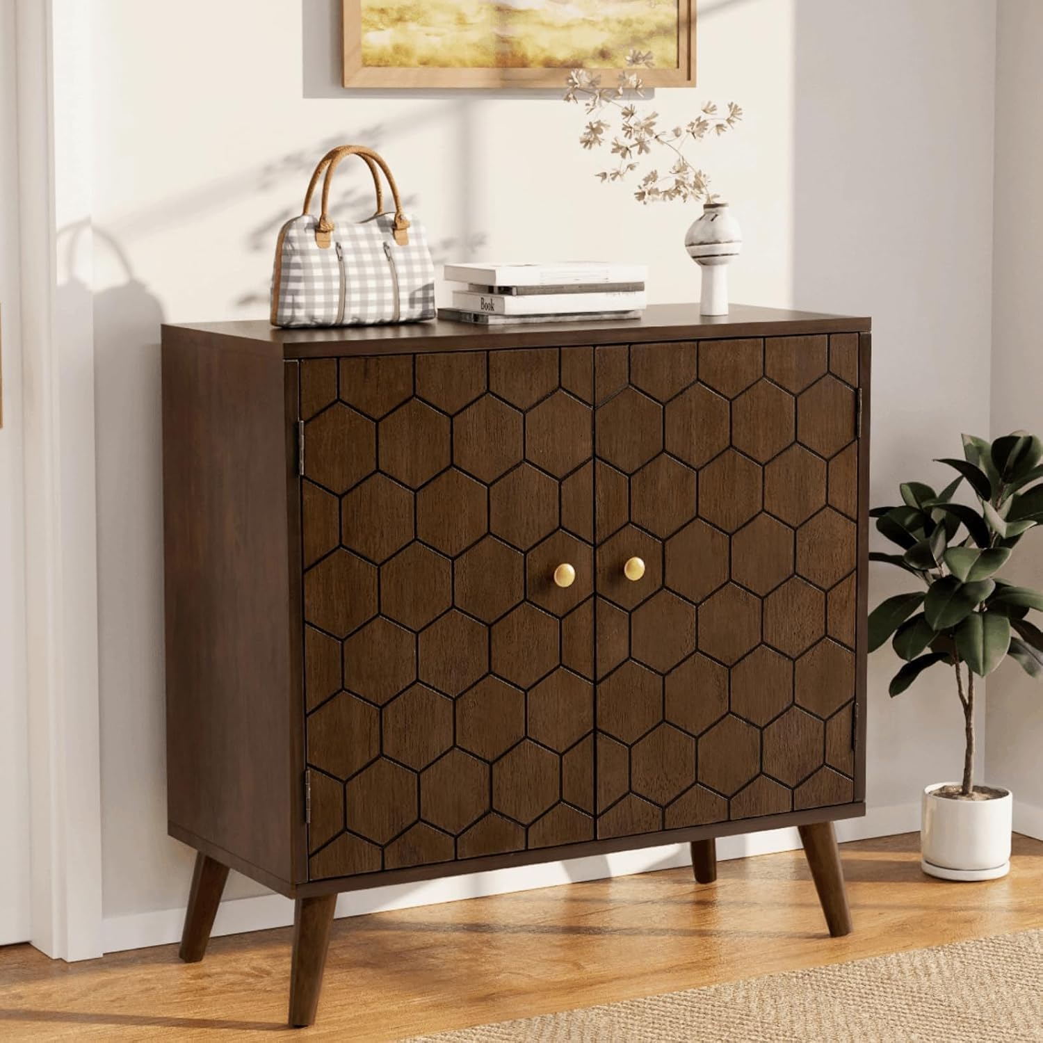 COSIEST 32" Storage Sideboard with Doors, Adjustable Shelf, Decorative Modern Accent Furniture for Living Room, Entryway, Kitchen (Brown, Honeycomb Pattern)